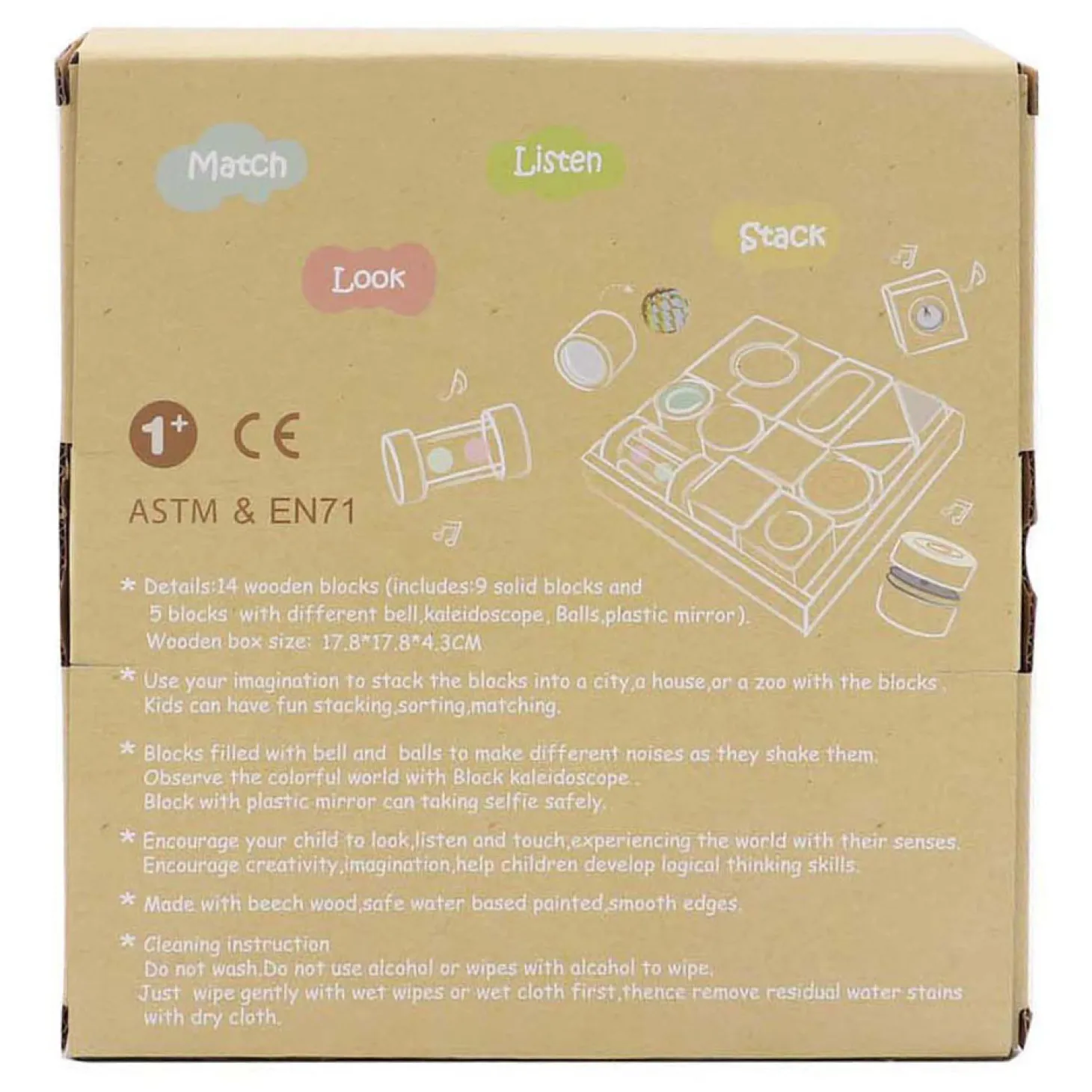 De sensorische speelblokken ontwikkelen de zintuigen en moedigen kinderen uit om te kijken, luisteren en voelen. Gemaakt van natuurlijk hout en bewerkt met kindveilige verf op waterbasis. Geschikt voor kinderen vanaf 12 maanden oud.