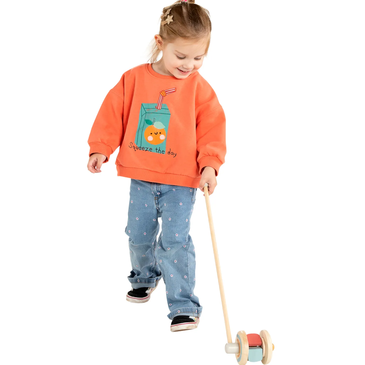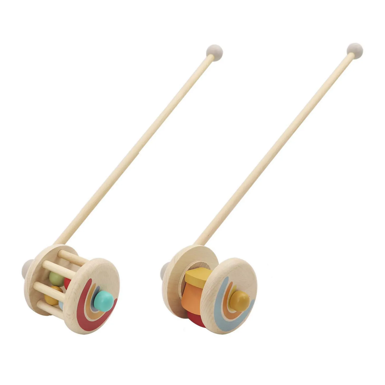 Houten duwstok met balletjesrammelaar aan de onderkant. Duw de stok door de kamer en laat de balletjes vrolijk rondkletteren! Leren lopen wordt zo wel héél leuk.Prijs per stuk, verschillende uitvoeringen/kleuren worden door elkaar geleverd.