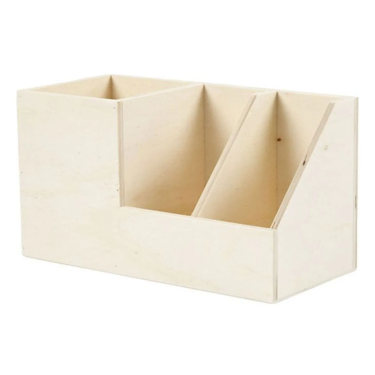 Combineer creativiteit en praktische opslag met deze rechthoekige pennenbak van licht hout, die u naar eigen inzicht kunt decoreren. De pennenbak bevat drie compartimenten, waarvan er twee een afgeschuinde zijkant hebben voor het eenvoudig opbergen van kleinere bureauartikelen.Zo kunt u het oppervlak van het hout schilderen met dekkende Plus Color hobbyverf en daarop decoreren met stiften uit dezelfde serie. U kunt ook decoreren met houtbranden patronen en lijnen met een houtbrander of het oppervlak bedekken met decoupage-technieken.
