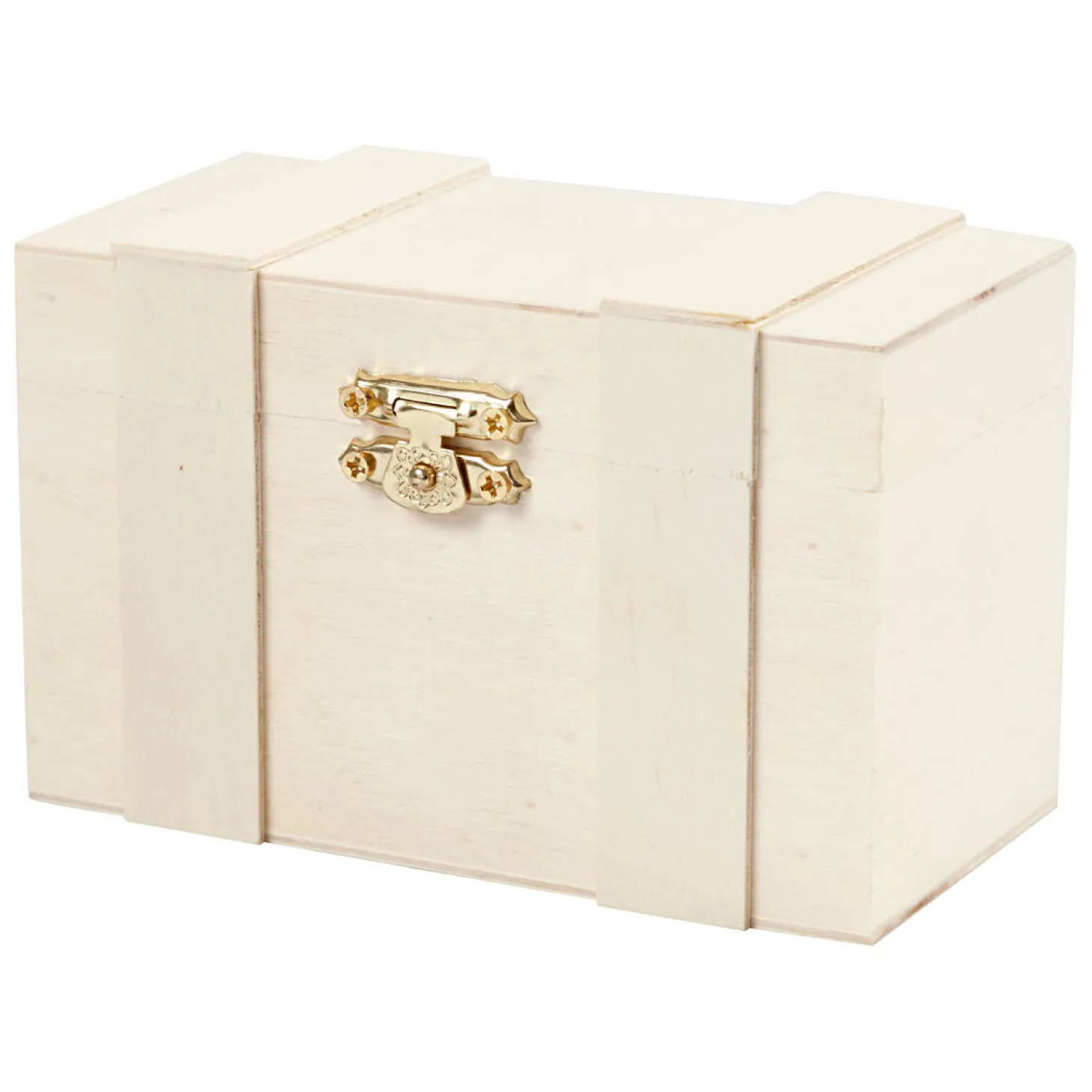 Schatkist van licht hout met metalen sluiting.Eenvoudig te decoreren met Plus Color acrylverf, houtbranden, stempels enzovoort.