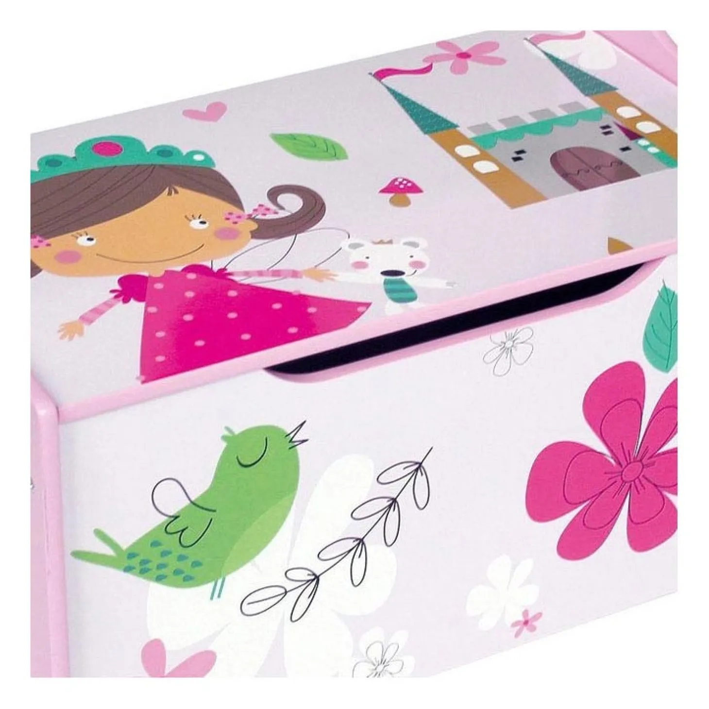 Berg al jouw speelgoed op in deze leuke speelgoedbank van hout. Deze kleurrijke kist heeft de afbeeldigen van een prinses, kasteel, bloemen en heeft leuke roze details. De speelgoedbank heeft een lengte van 60 cm is 35 cm breed en heeft een hoogte van 61,5 cm. De zithoogte is 33,5 cm.