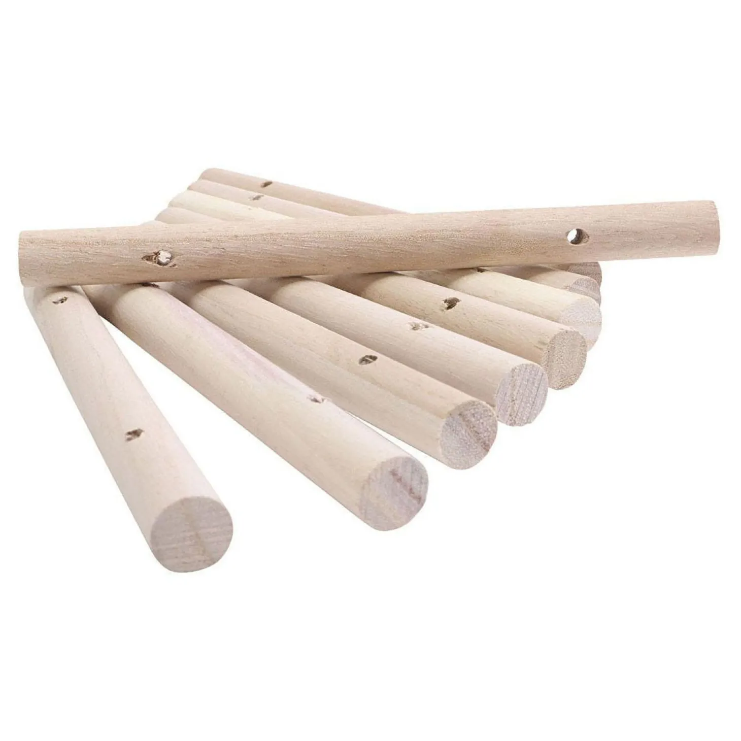 Staven van onbewerkt hout met voorgeboorde gaten. Kan worden geverfd met hobbyverf en met een touwtje worden vastgemaakt om bijvoorbeeld mooie onderzetters te maken. Je kunt er ook houten kralen tussen plaatsen