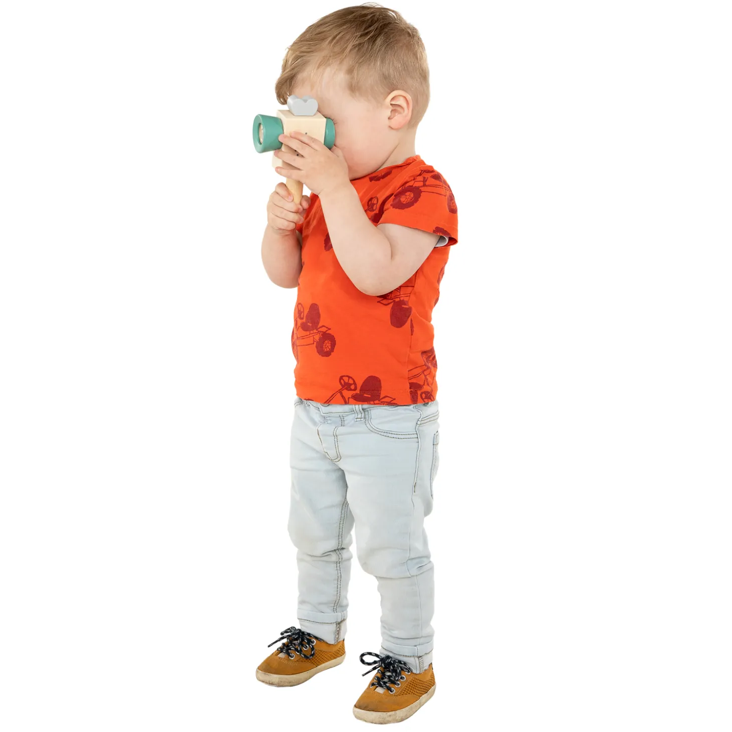 Maak je eigen video met deze ouderwetse, houten videocamera! Deze houten videorecorder heeft de look van een ouderwetse videocamera. Kijk door de lens, wat zie je? Draai aan de knop om “op te nemen”. De videocamera heeft blauwe en gele accenten.