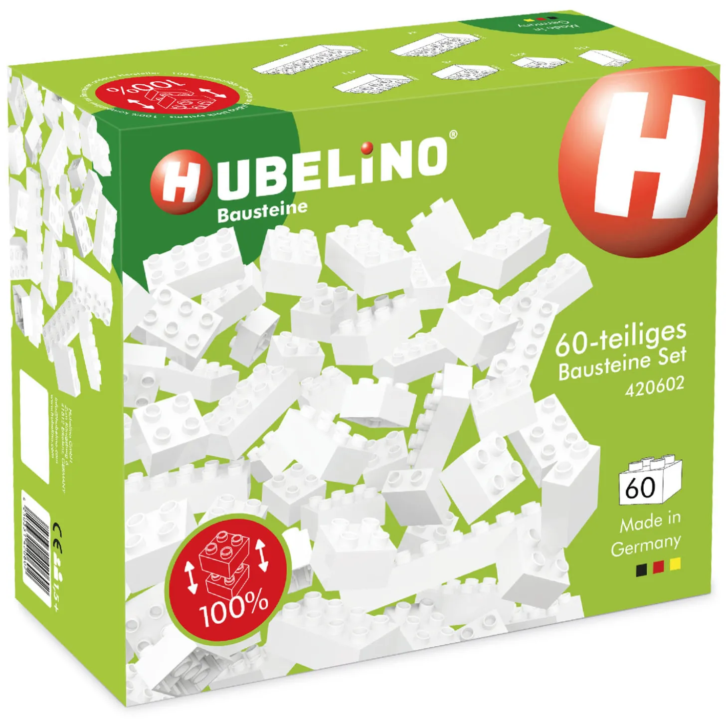 Deze bouwstenen set van Hubelino bevat 60 witte bouwstenen in verschillende maten. De populaire 1×2 bouwstenen voor een knikkerbaanconstructie zitten ook in de set. De bouwstenen worden in Duitsland geproduceerd en zijn compatibel met andere gangbare bouwsteen systemen van andere fabrikanten. Geschikt vanaf 2 jaar.