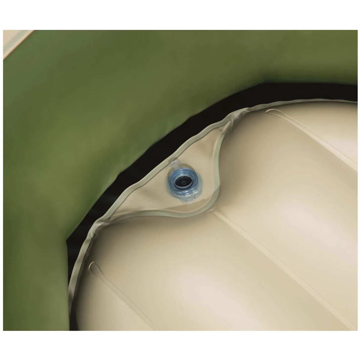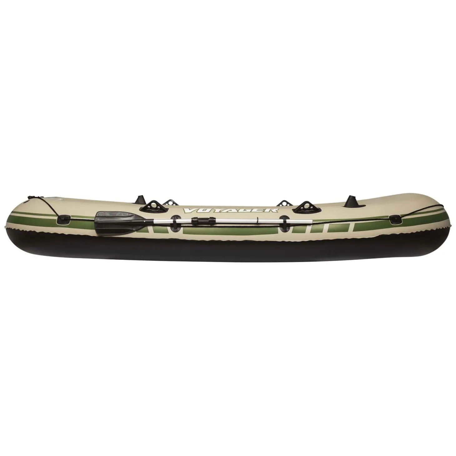 Ruime, opblaasbare visboot. Met eveneens opblaasbare boden en kussens voor meer comfort. Hengelhouders, rondom een koord, handige opbergruime, sterke dollen en een stevig handvat. Incl. 1 paar aluminium riemen en reparatie patch. Geschikt voor 3 personen (max. 260 kg). Afmeting: 348×141 cm.