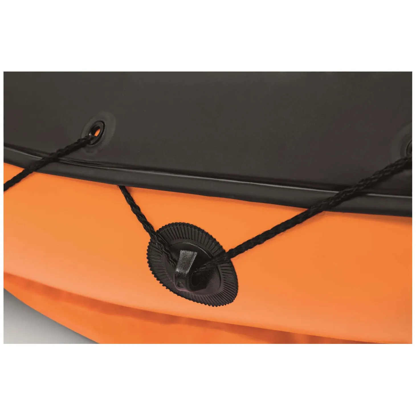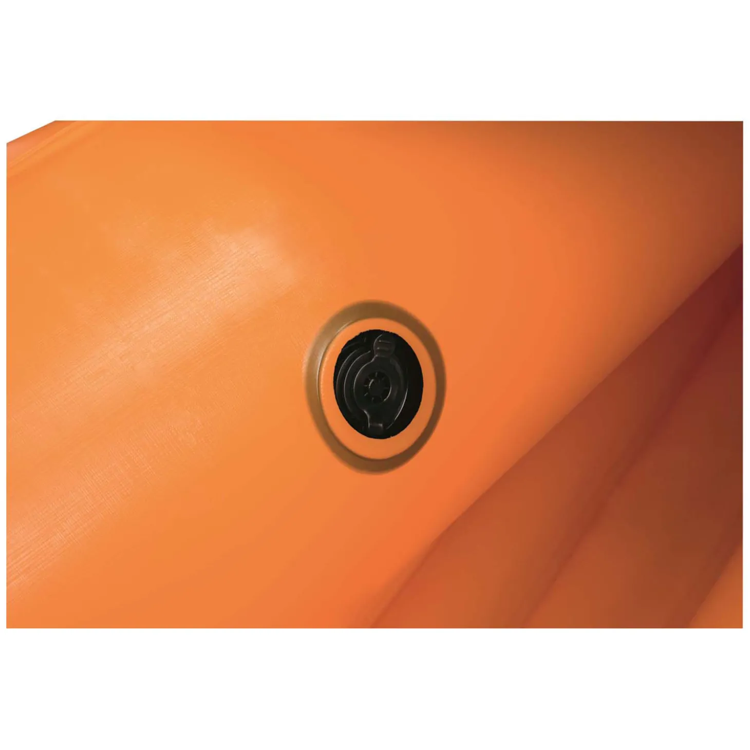 2 persoons kajak. De vormvaste constructie voorkomt dat er water in de boot komt, de twee opblaasbare zitjes zijn verstelbaar en de middenvin, die zorgt voor stabiliteit, kan verwijderd worden. Incl. 2 aluminium peddels van 218 cm met kunststof bladenen reparatie patch. Max. gewicht 160 kg. Afmeting: 321×88 cm.