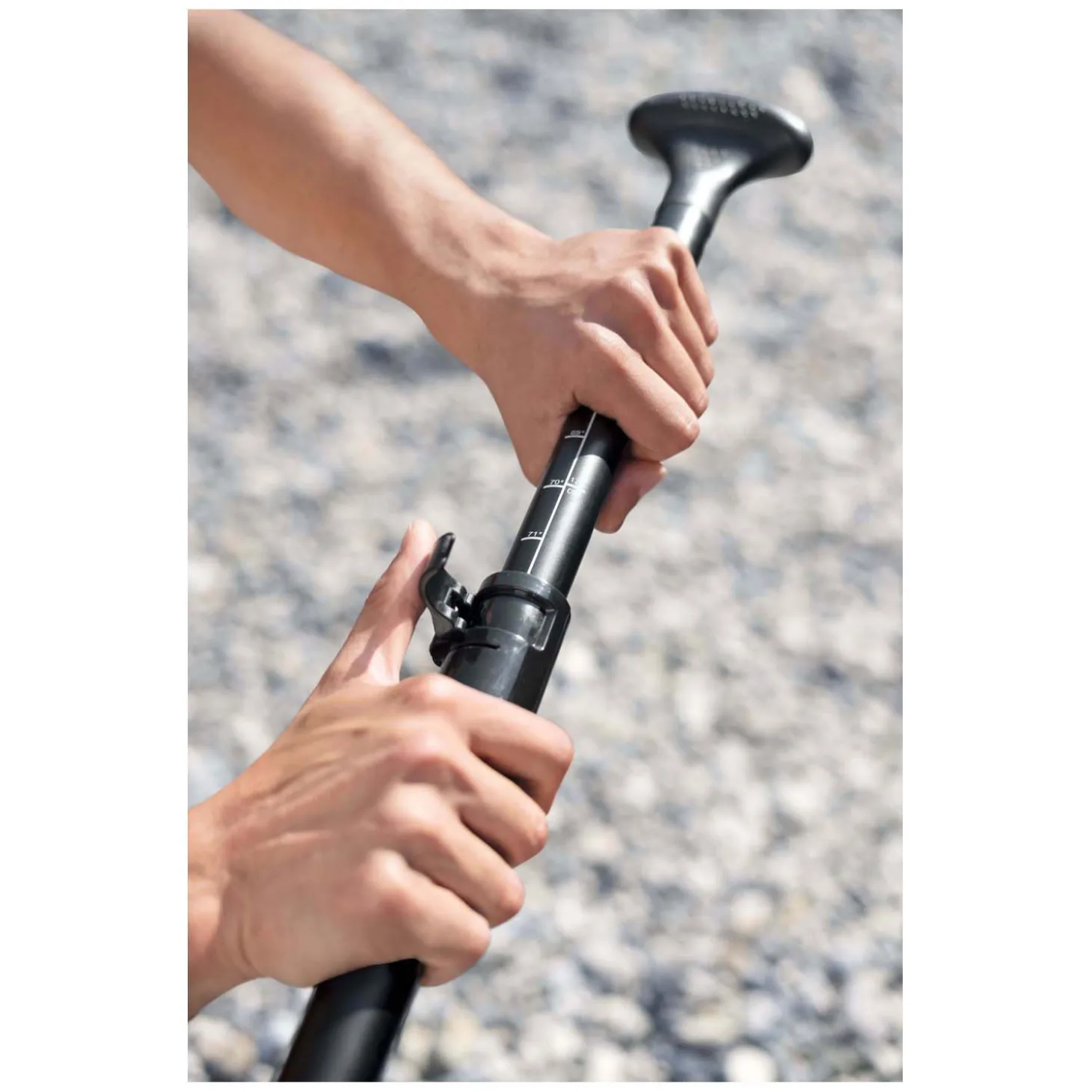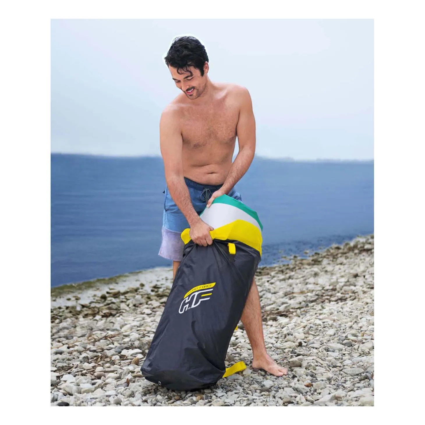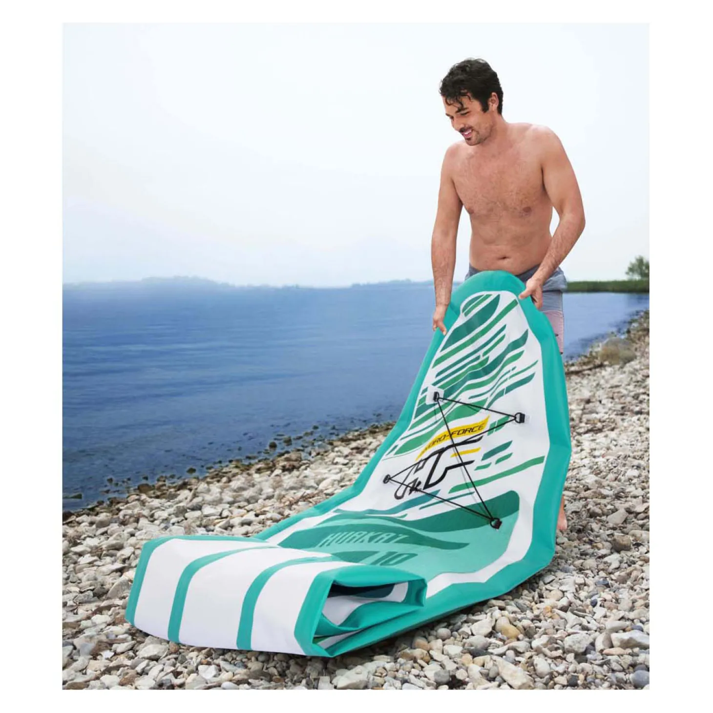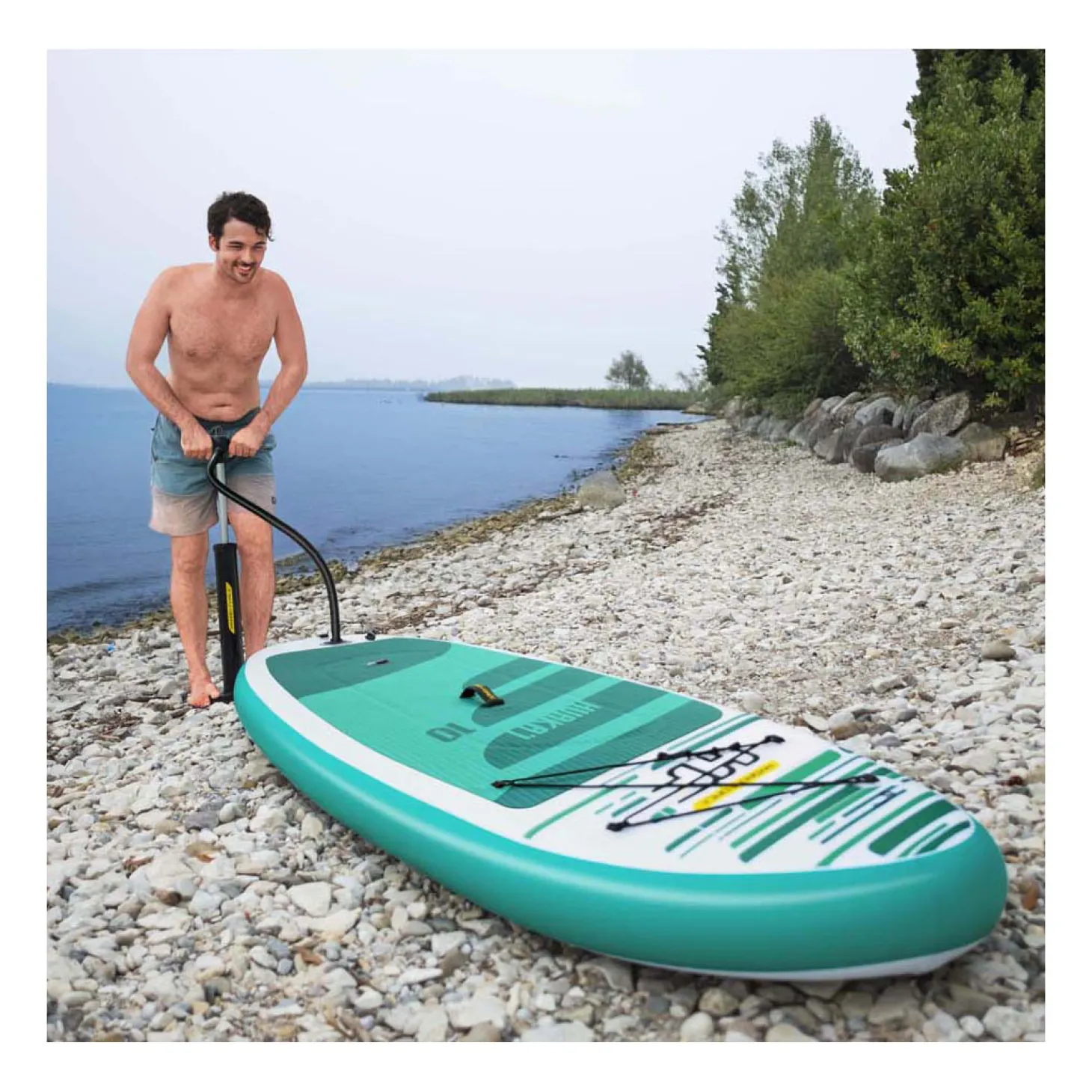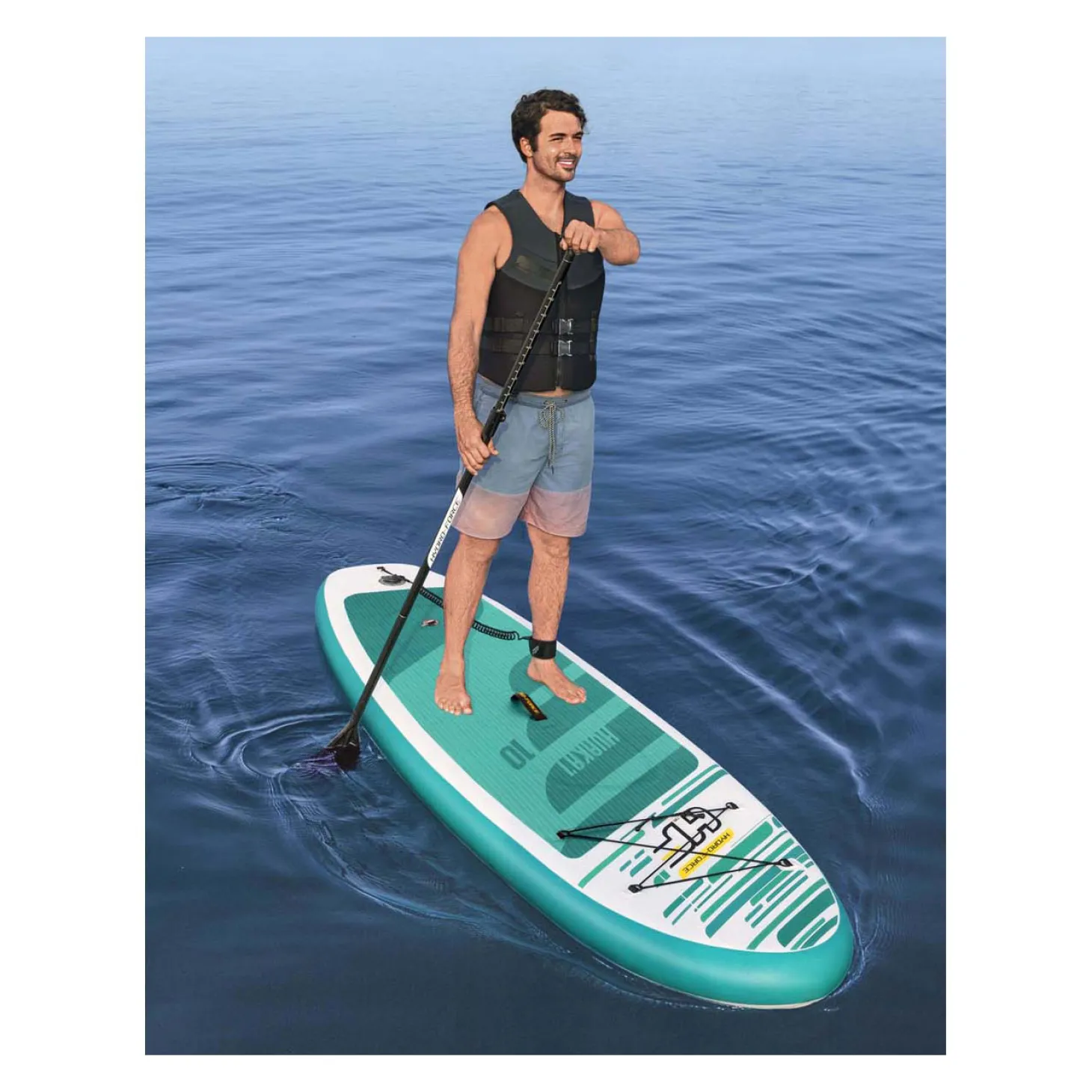 De constructie met twee kamers is een kenmerk dat de stabiliteit verbetert. Het heeft een opzettijd van slechts 5 minuten en een handig luchtventiel voor snel oppompen en leegmaken. Incl. peddel, handpomp, rugzak, spiraalkoord, vin en een reparatieset. Tas met inhoud weegt 12 kg.