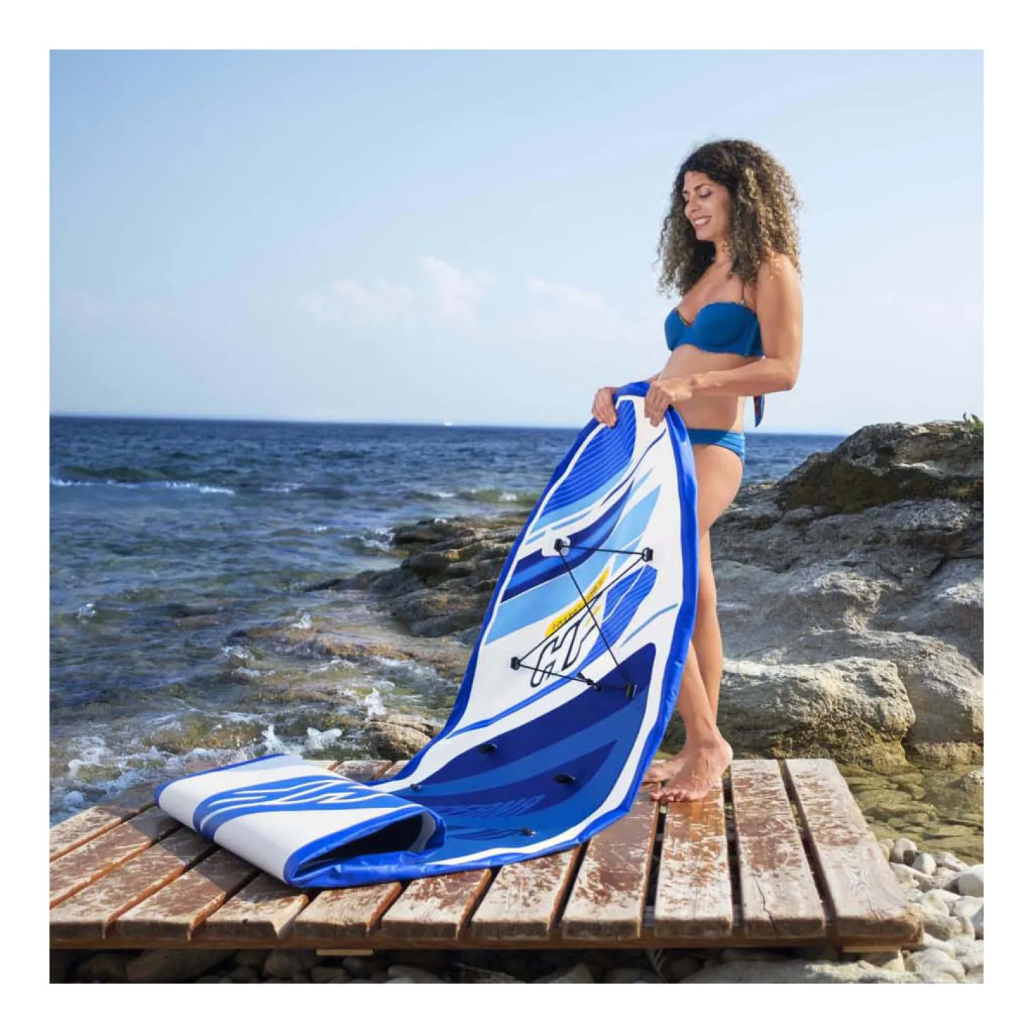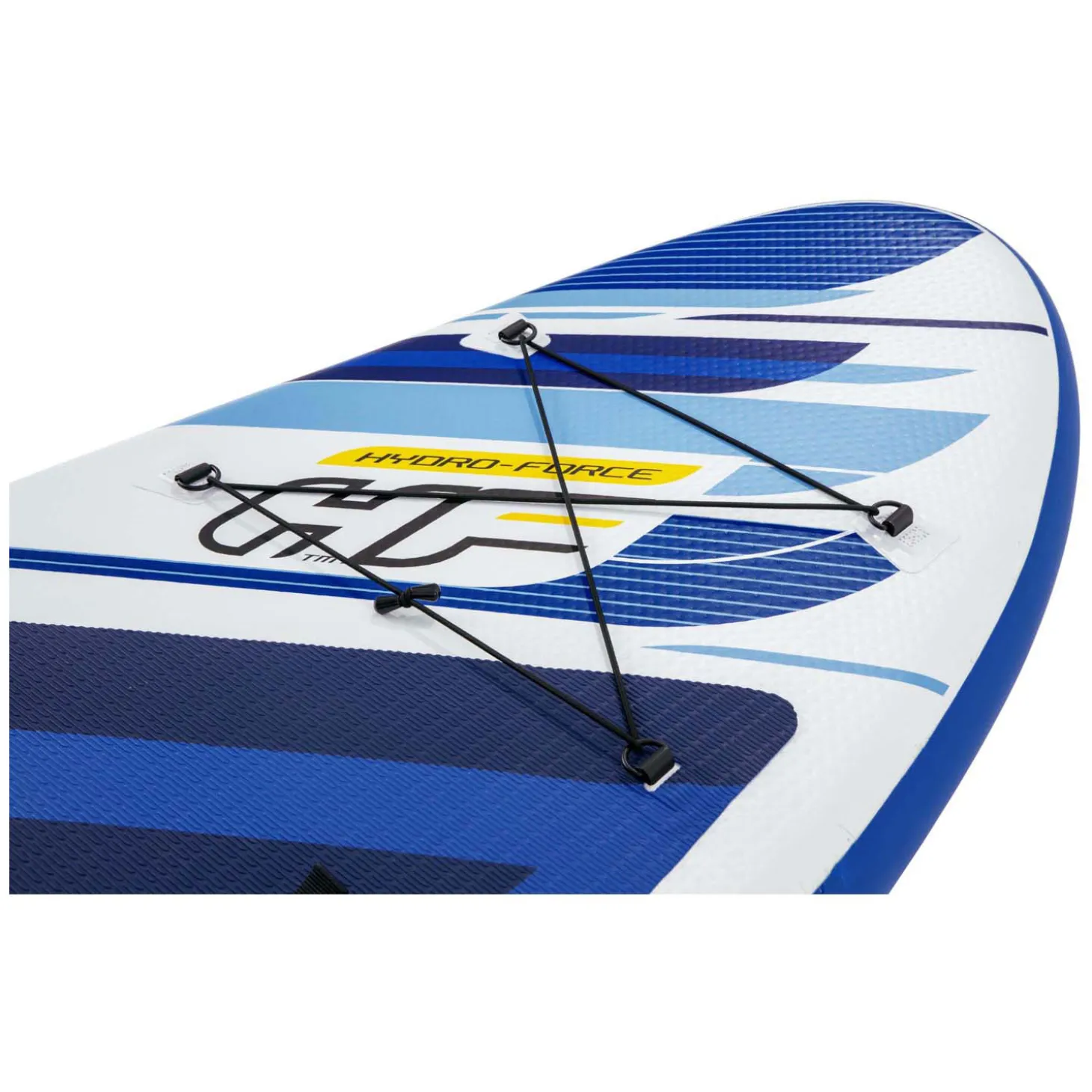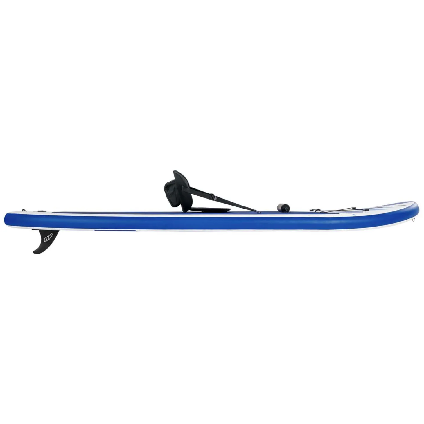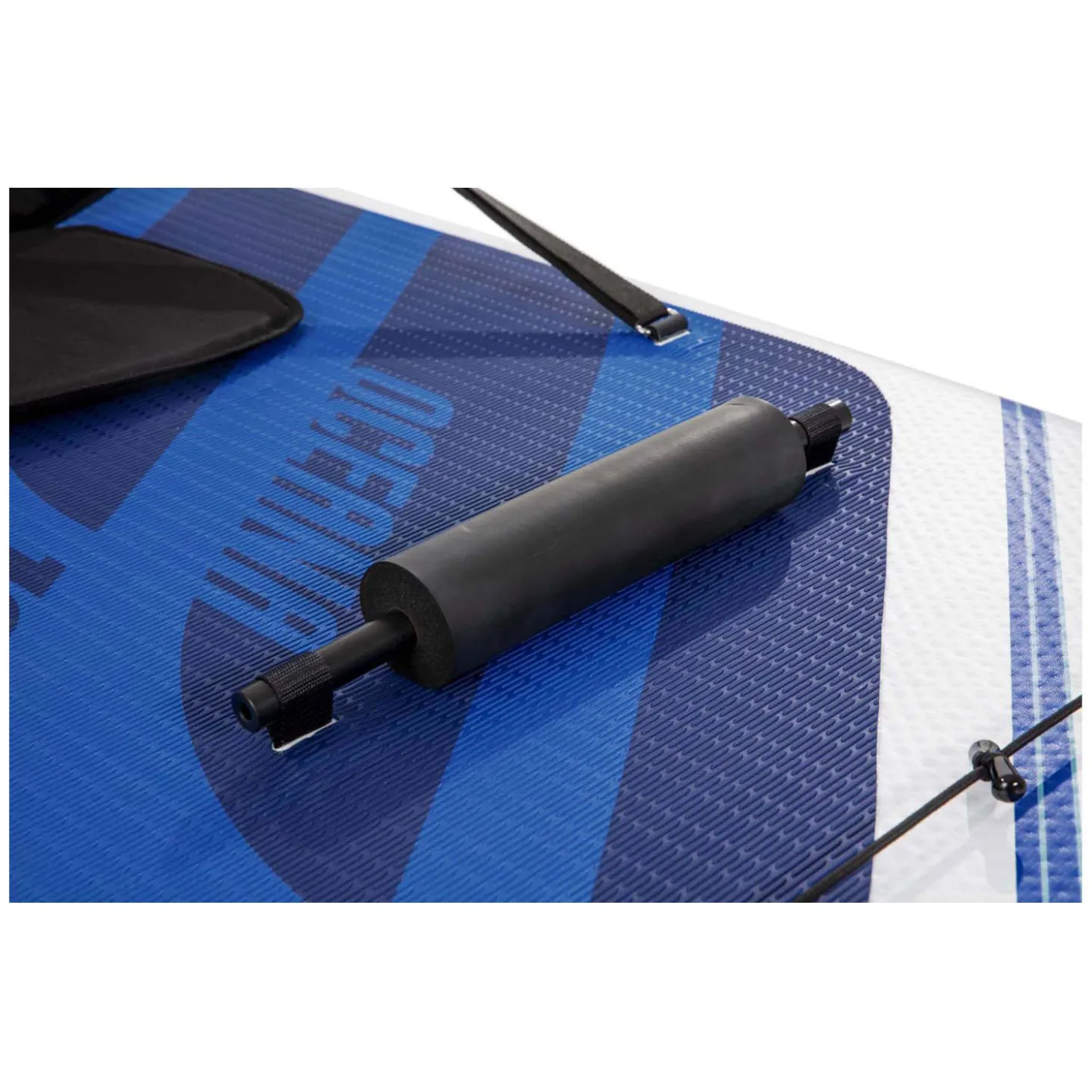 Het elastische koord en de roestvrijstalen ringen aan de voor- en achterkant zijn voor het bevestigen van accessoires. Incl. peddel, handpomp, rugzak, spiraalkoord, zitting, voetensteun, vin en reparatieset. Tas met inhoud weegt 11,5 kg. De SUP kan maximaal 120 kg dragen.