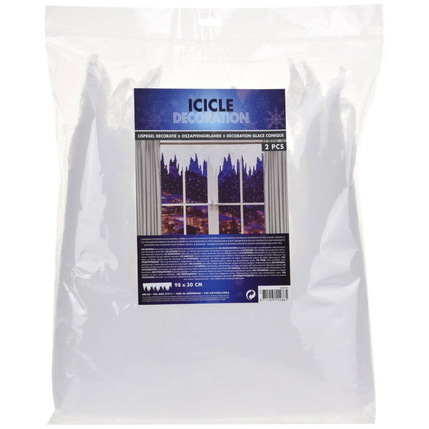 Ijspegel sneeuwrand van 98 x 30 centimeter groot, te gebruiken als decoratie van bijvoorbeeld muren en ramen. In de verpakking zitten 2 slingers.