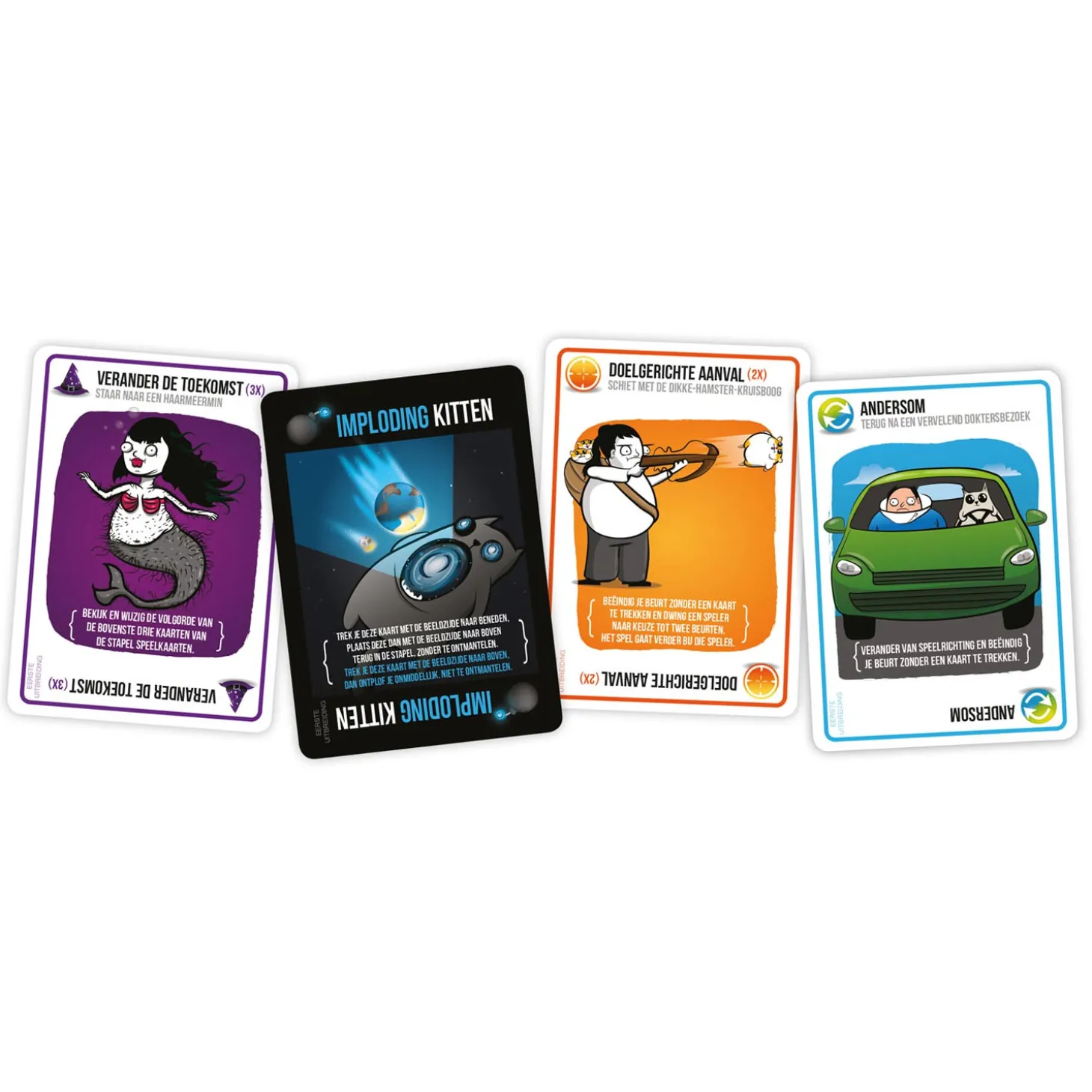 Trek je de Imploding Kitten kaart voor de eerste keer, plaats deze dan – met de beeldzijde naar boven – terug in de stapel op een positie naar keuze. Vervolgens kun je deze kaart zien aankomen dankzij de zwarte rand rondom de kaart. Heb je geen andere optie dan deze kaart van de stapel te moeten trekken, dan implodeer je onmiddellijk en lig je uit het spel. Deze kaart kan niet onschadelijk gemaakt worden door een Ontmantelkaart.