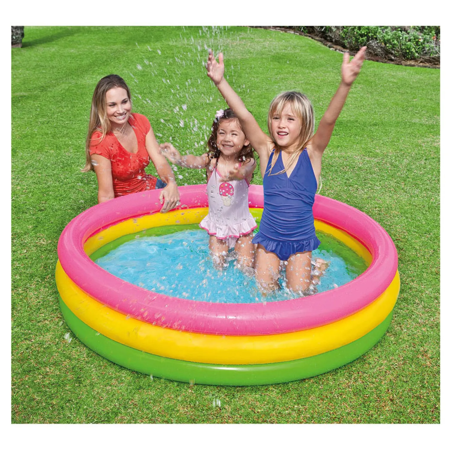 Intex Sunset Glow Pool is een mooi 3-rings opblaasbadje met een afmeting van 147 x 33 cm. De doorsnede van het bad is 19 cm, er kan 136 liter water in. Bevat een reparatievel. Geschikt voor kinderen vanaf 2 jaar.