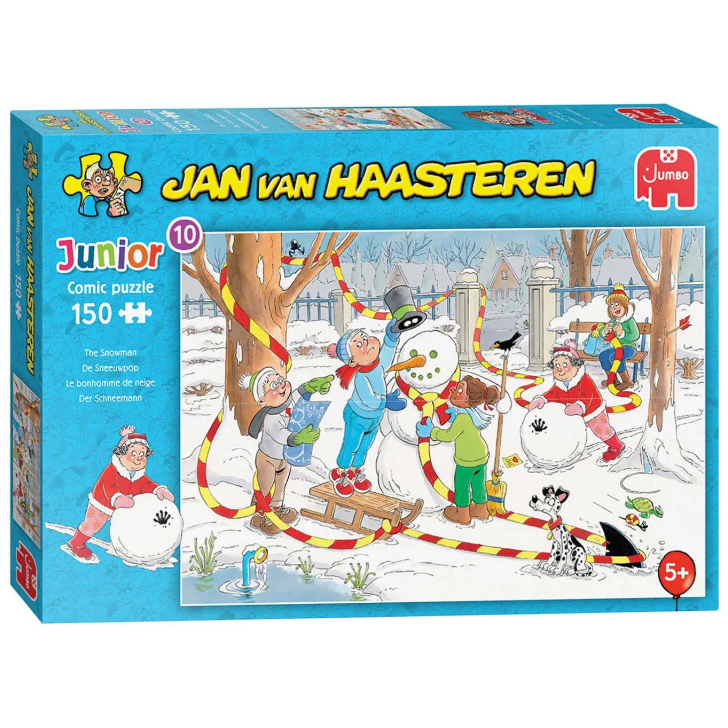 Het sneeuwt! De vrienden van Jan van Haasteren Junior gaan samen aan de slag om de beste sneeuwpop te maken. Maar passen ze wel op? De Haai gaat er met volle snelheid vandoor, en dit zou nog wel eens voor roet in het eten kunnen zorgen! Deze humoristische puzzel van 150 stukjes is geschikt voor kinderen vanaf 5 jaar.