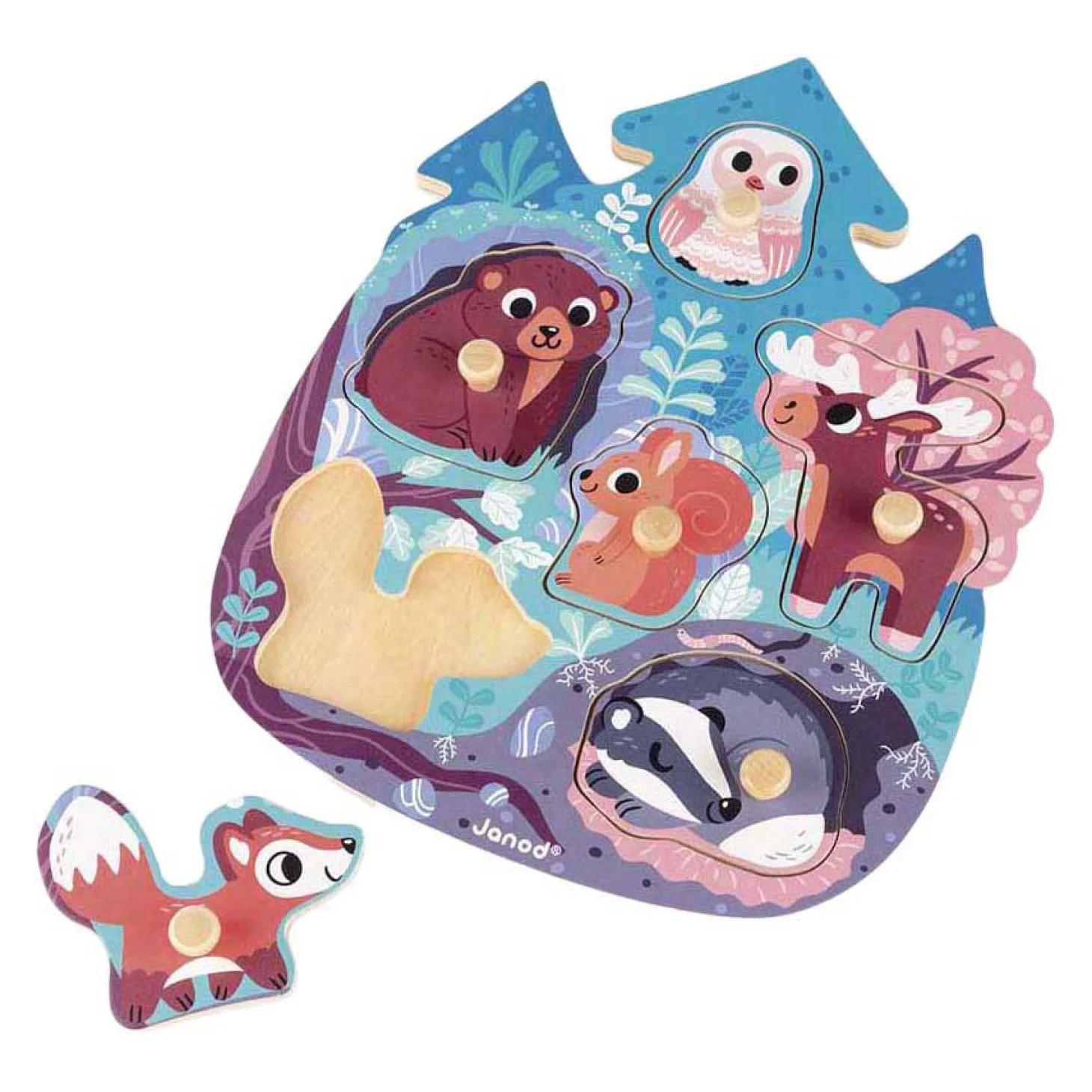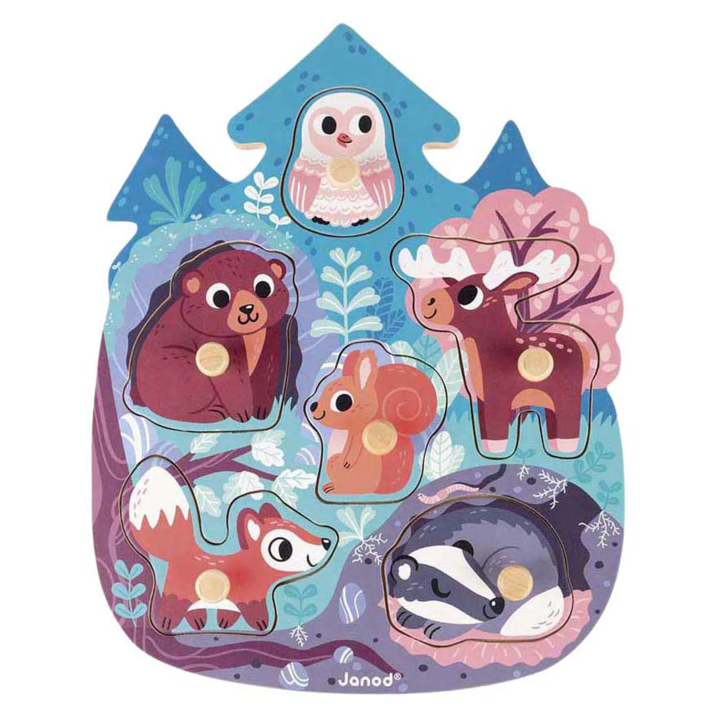•Houten knopjespuzzel met 6 stukjes en stevige knoppen voor kleine handjes