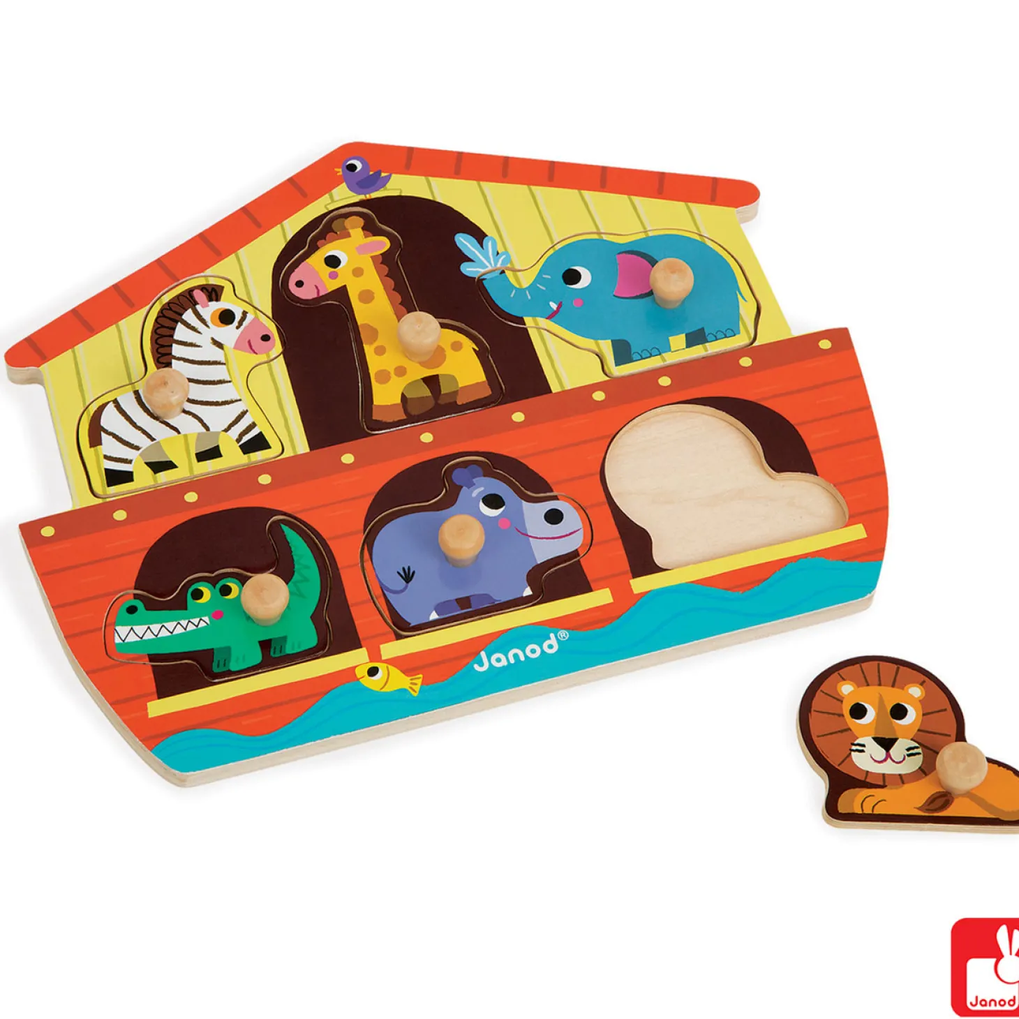 Houten noppenpuzzel van Janod. Breng de 6 dieren naar de juiste plek in de boot!