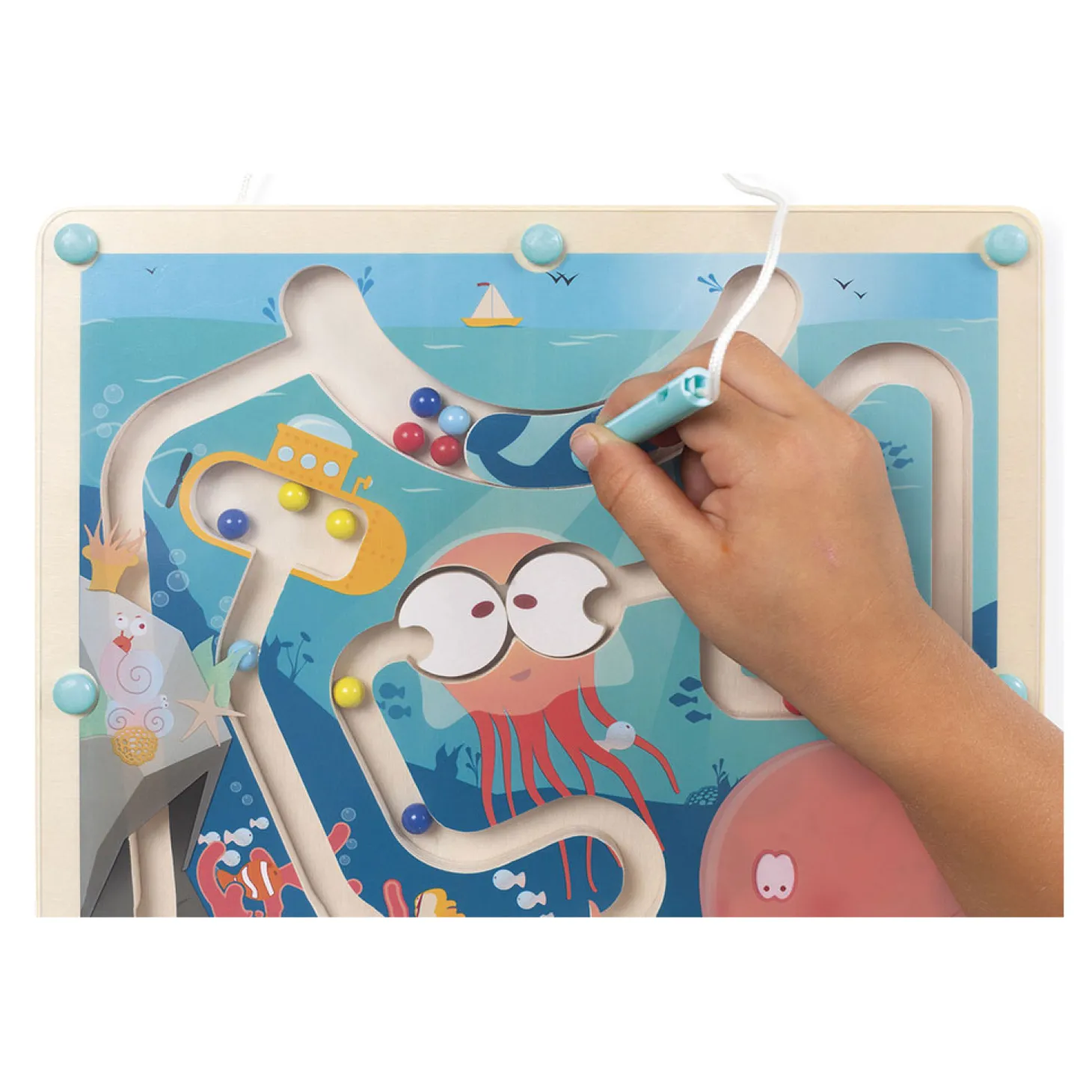 Ga vanaf de bodem van de oceaan door het doolhof en breng de 16 knikkers naar de onderzeeër met behulp van de magneetpen. Je zult je vaardigheden moeten aanwenden om alle hindernissen te nemen: de ogen van de inktvis die in alle richtingen draaien, geheime doorgangen. En pas op voor de ogen van de octopus die doen waar ze zin in hebben wanneer de knikker er voorbij gaat! FSC-gecertificeerd. 2-5 jaar.