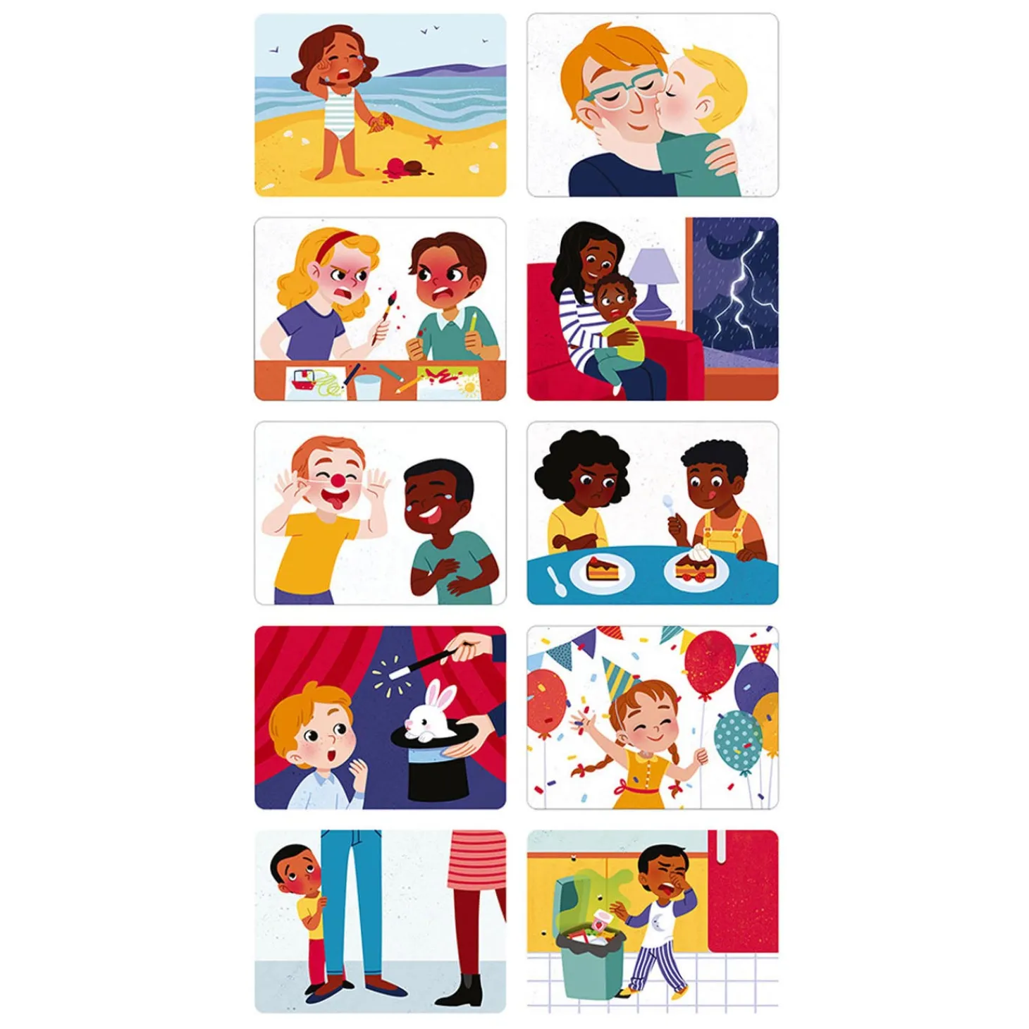 Leer op een leuke manier emoties te koppelen aan gezichtsuitdrukkingen met dit spel! De magnetische kaarten laten allerlei kinderen zien met een bepaalde gezichtsuitdrukking. Je kunt het magnetische kaartje met de bijbehorende emotie aan de kaart laten plakken. Er zijn wel 20 kaarten waar je uit kunt kiezen! Geschikt van 2 tot 5 jaar.