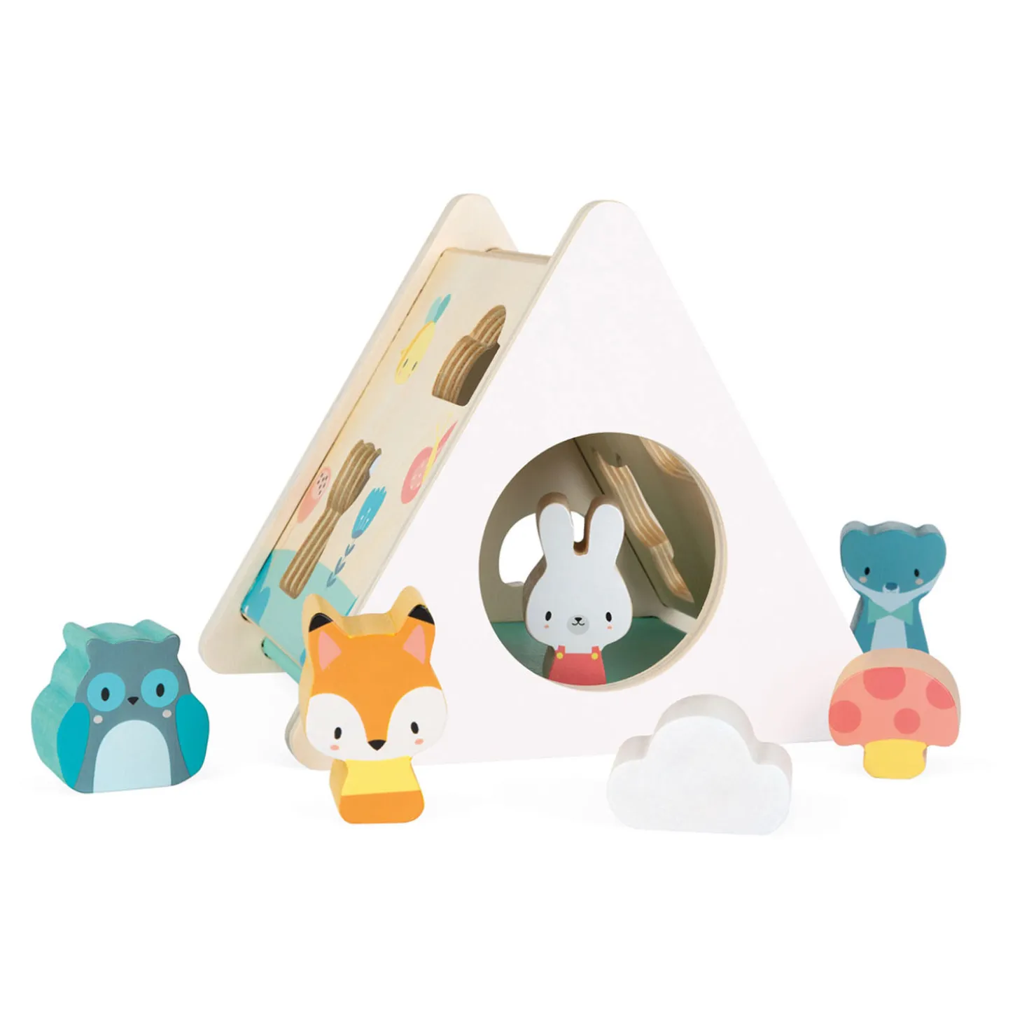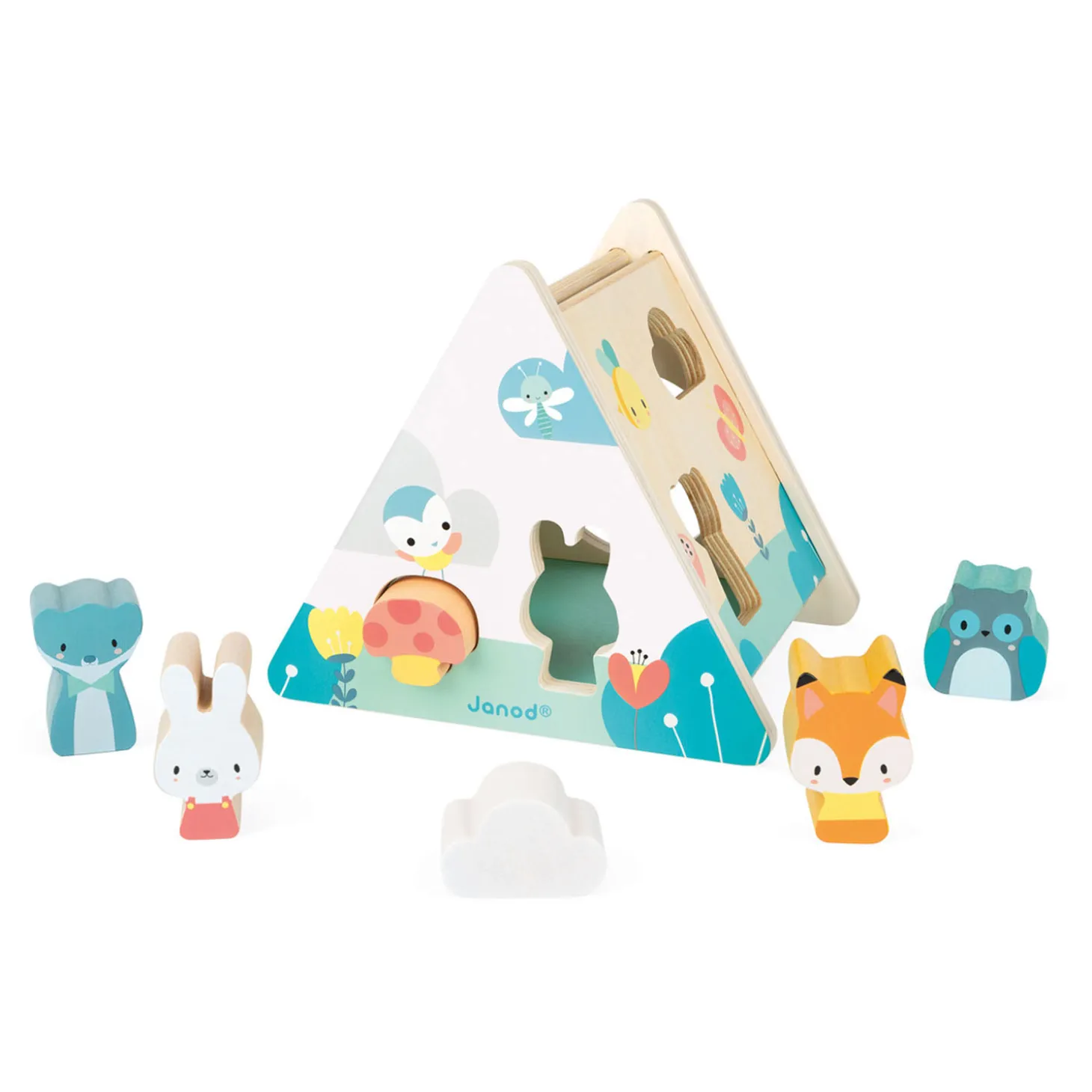 Deze driehoekige houten vormstoof van Janod is bedrukt met zachte, eigentijdse kleuren en bevat super schattige dieren. Door de dieren en vormen te sorteren, kan je peuter zijn behendigheid ontwikkelen terwijl hij plezier heeft! Het artikel bevat een vormenstoof, vier diertjes en twee vormpjes.