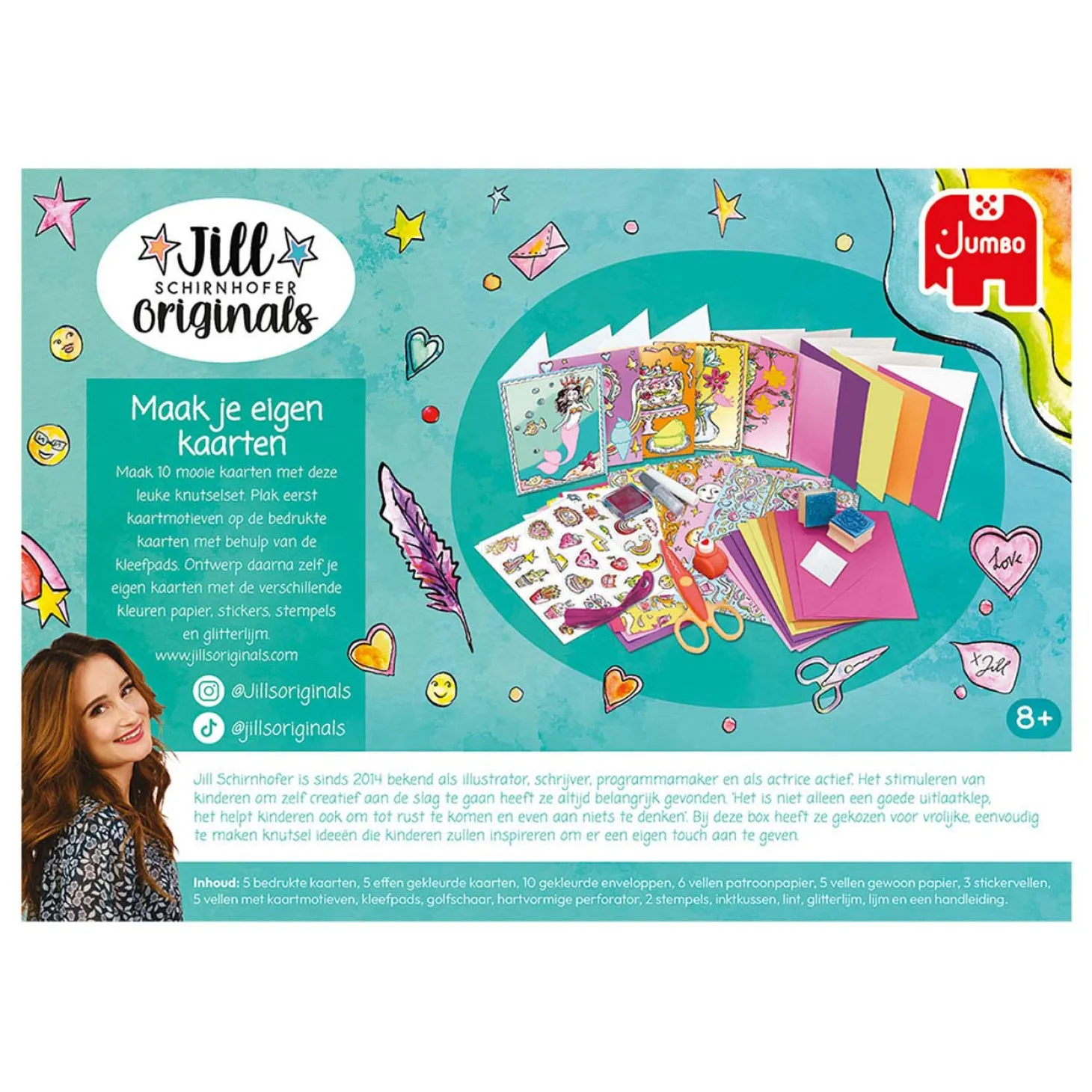 Jill Schirnhofer is sinds 2014 bekend als illustrator, schrijver, programma-maker en actief als actrice. Het stimuleren van kinderen om zelf creatief aan de slag te gaan heeft ze altijd belangrijk gevonden. ‘Het is niet alleen een goede uitlaatklep, het helpt kinderen ook om tot rust te komen en even aan niets te denken’. Bij deze box heeft ze gekozen voor een vrolijk, eenvoudig te maken knutselidee dat kinderen zal inspireren om hun creativiteit er op los te laten en eigen kaarten te ontwerpen!