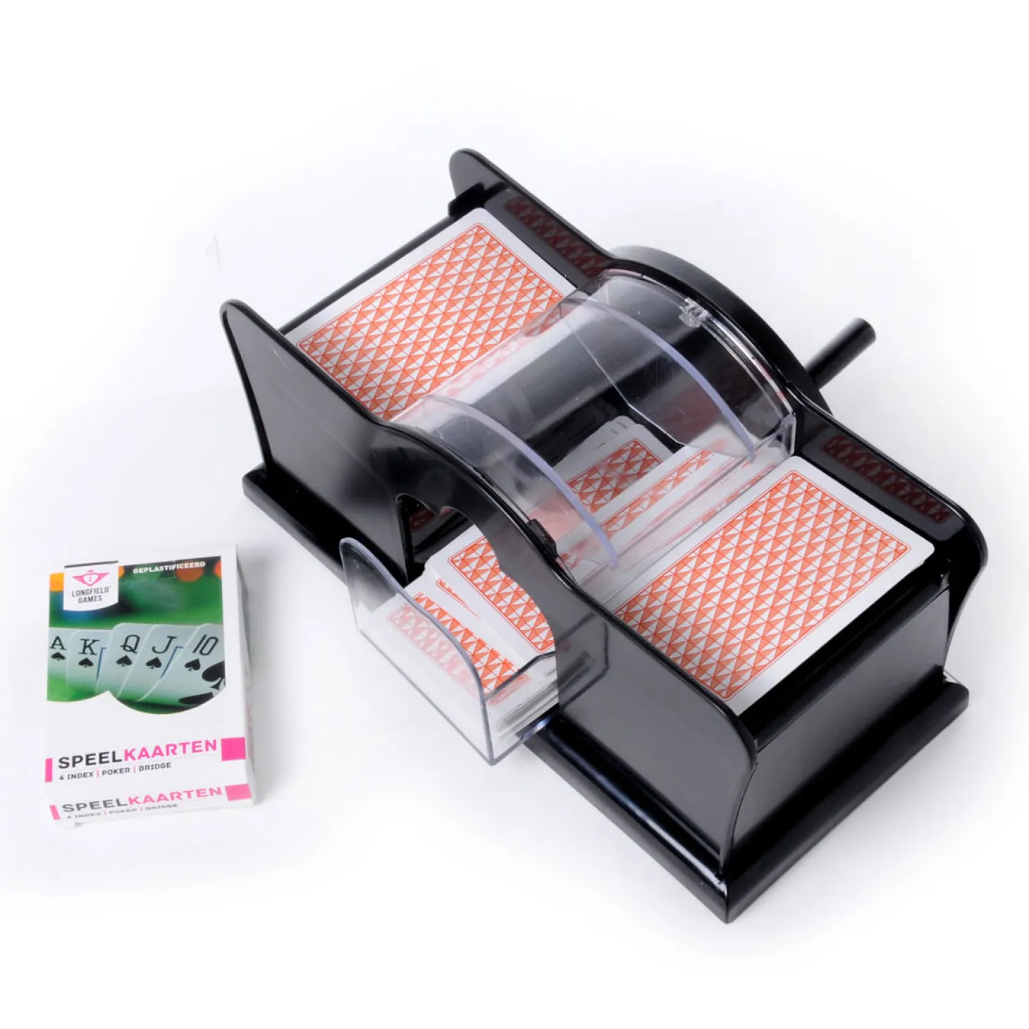 Schud eenvoudig de kaarten met deze kaartschudmachine. Leg de kaarten in de vakjes, draai aan de hendel en zie de kaarten over en weer vliegen. Wanneer je klaar bent met draaien kun je de stapel kaarten zo uit het bakje halen. Exclusief pakje speelkaarten.