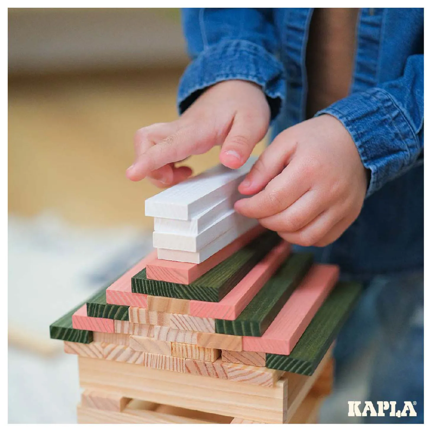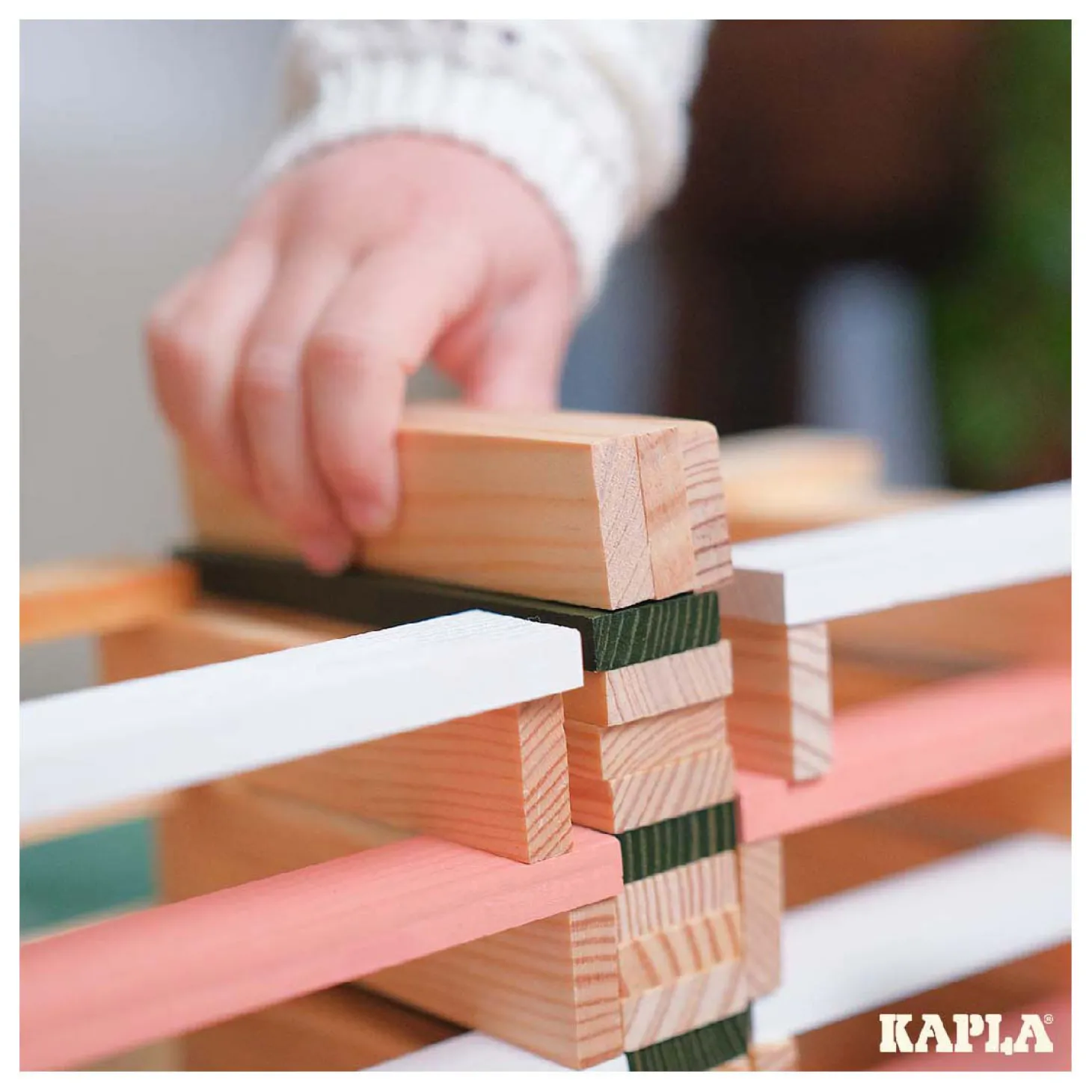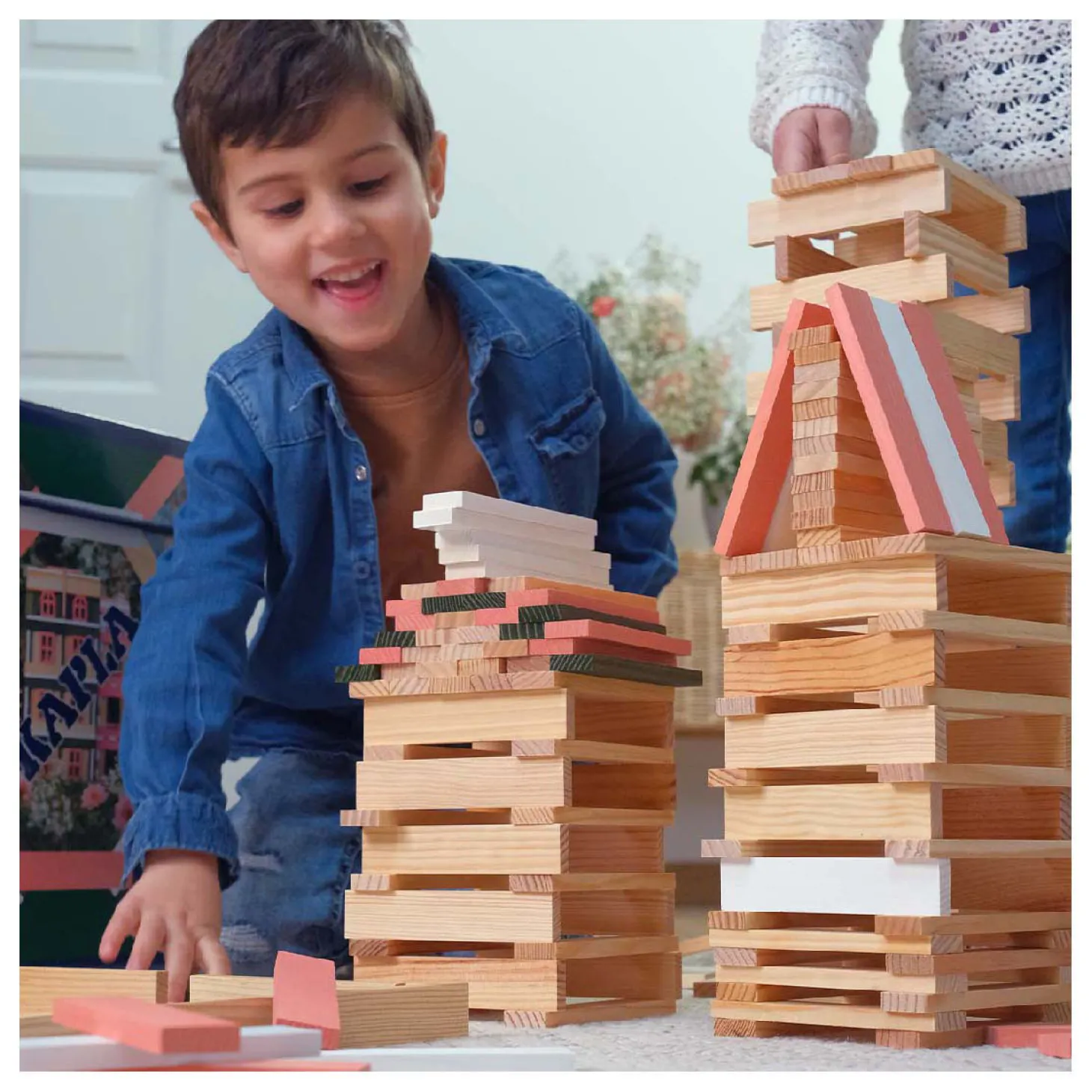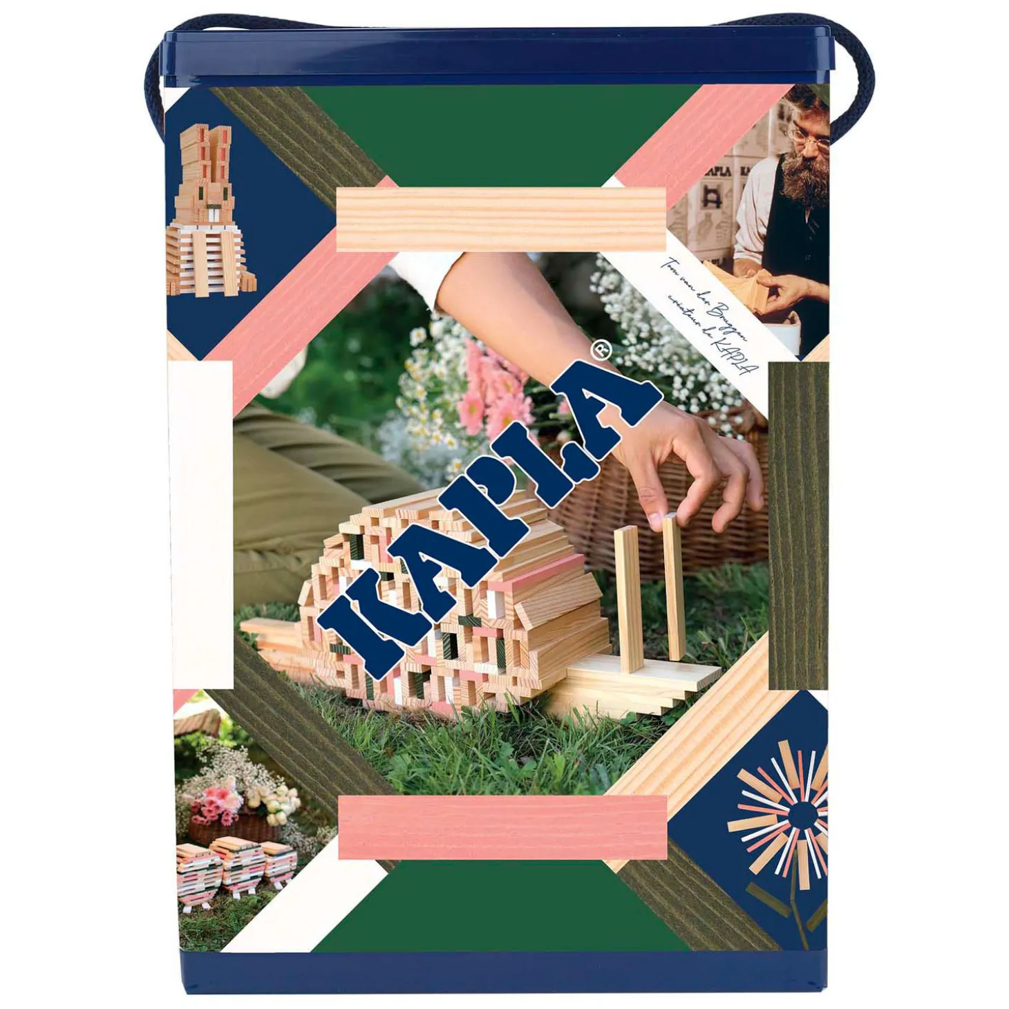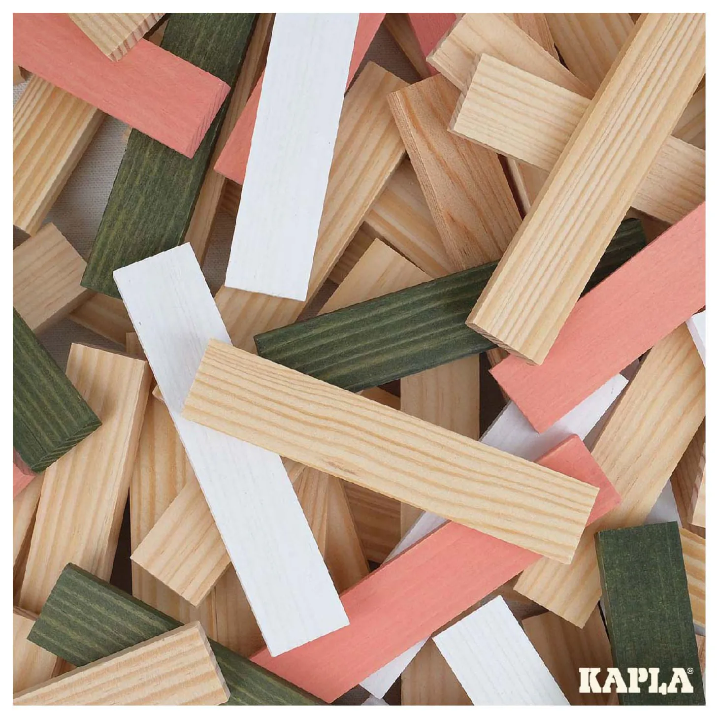 De Lente Barrel bevat 200 natuurlijke Landes grenen planken (x140 Natuurlijk, x20 Wit, x20 Groen, x20 Roze) evenals een A5 formaat drieluik met 3 nieuwe constructies stap voor stap.