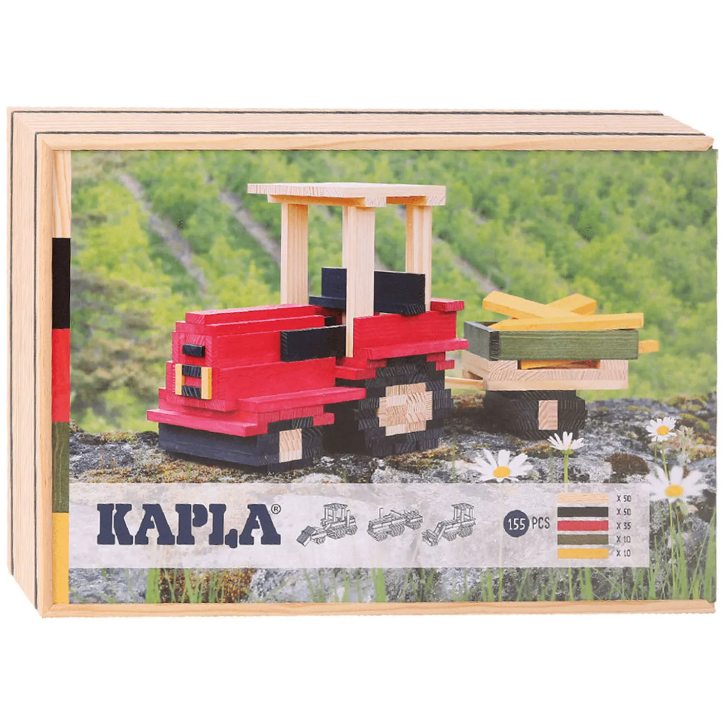 In deze mooie houten koffer wacht een selectie van 155 KAPLA-plankjes op je: 50x blank, 50x zwart, 35x rood, 10x geel en 10x groen. Al onze plankjes worden gekleurd met voedselverf om de veiligheid van de allerkleinsten te garanderen.