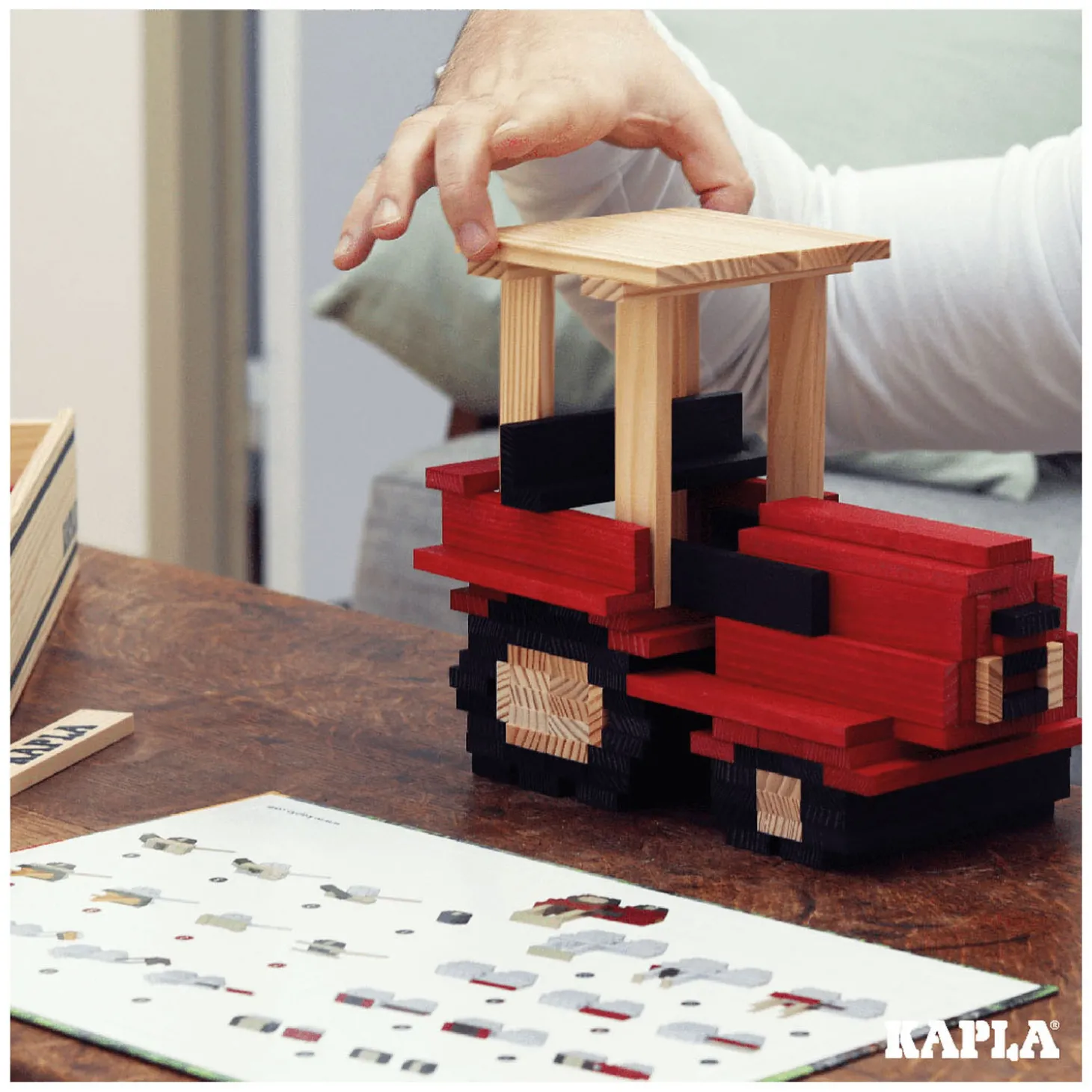 Met de KAPLA-plankjes met identieke afmetingen kan oneindig worden gespeeld en gecreëerd. De plankjes worden eenvoudigweg gestapeld, zonder lijm of bevestiging en kan je bouwen wat in je hoofd opkomt… Een KAPLA-werkje is vergankelijk van nature, en het afbreken is soms net zo prettig als het bouwen. De volgende dag ontstaan met dezelfde plankjes een nieuw universum en andere denkbeeldige structuren…