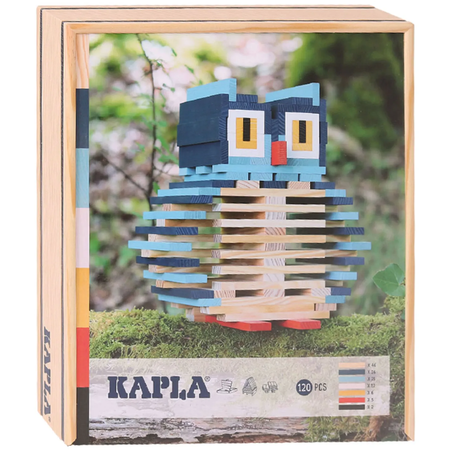 Deze houten koffer bevat een kleurige selectie van 120 plankjes (46x blank, 26x donkerblauw, 25x lichtblauw, 12x wit, 6x geel, 3x oranje, 2x zwart) om zijn creativiteit naar buiten te laten komen.