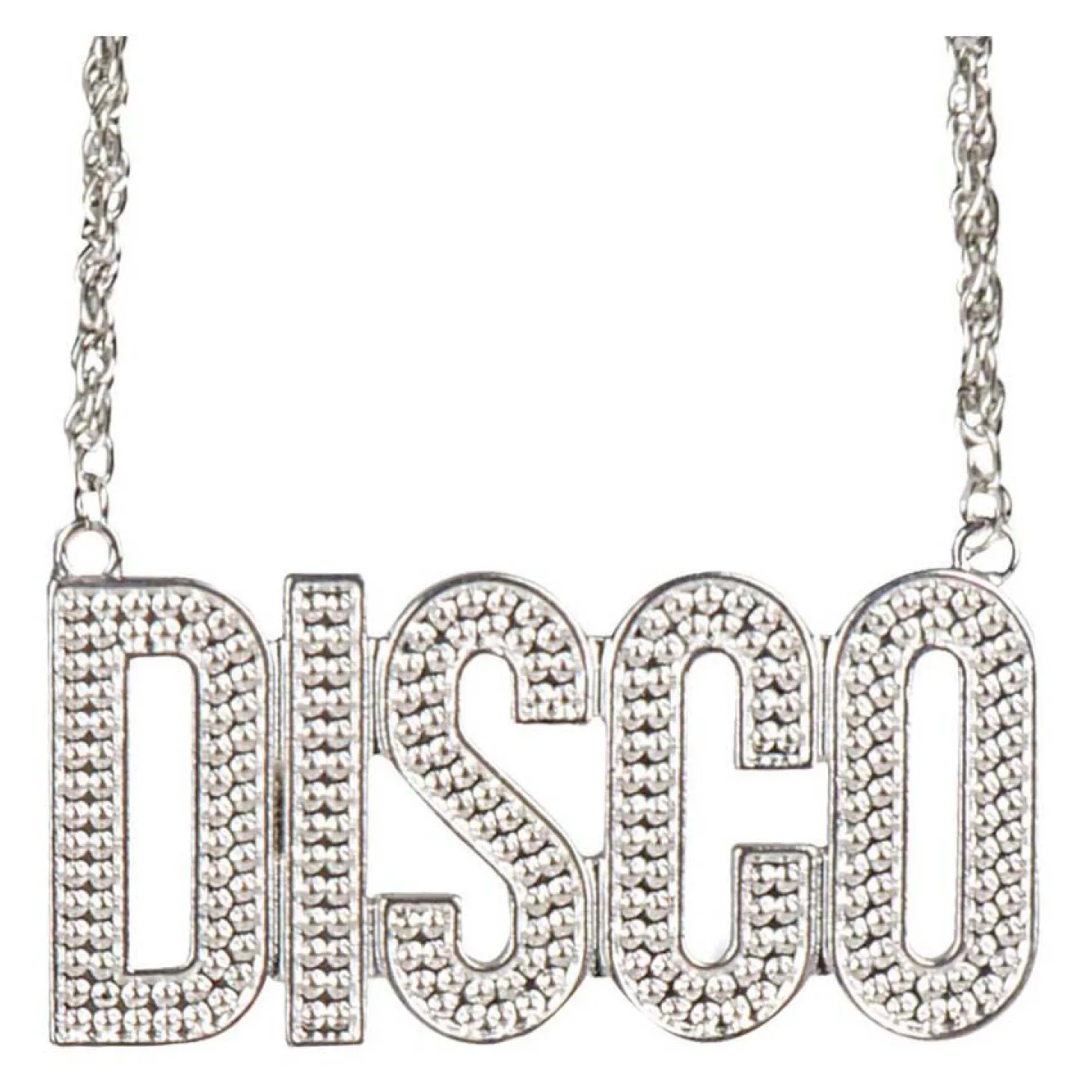 Leuke halsketting van met een grote DISCO-hanger met nepkristalletjes. De zilverkleurige ketting is gemaakt van kunststof en geschikt voor volwassenen. Een leuke aanvulling op een disco verkleedkostuum of een outfit voor een foute party!
