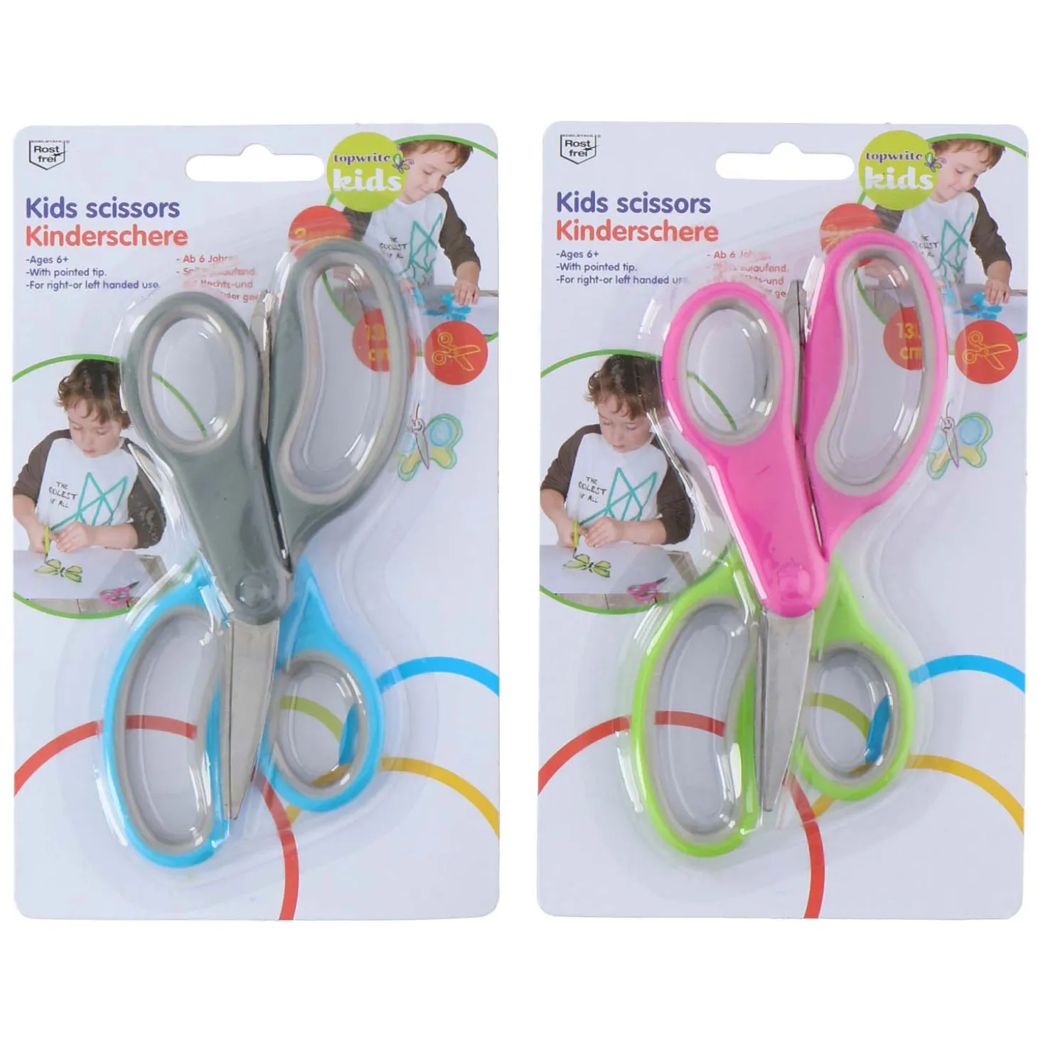 Set van 2 knutselscharen voor kinderen. De scharen zijn geschikt voor kinderen vanaf 6 jaar oud en hebben een gekleurd handvat. Geschikt voor links- en rechtshandigen. Afmetingen: ca. 13 centimeter groot.Prijs per stuk, verschillende uitvoeringen/kleuren worden door elkaar geleverd.