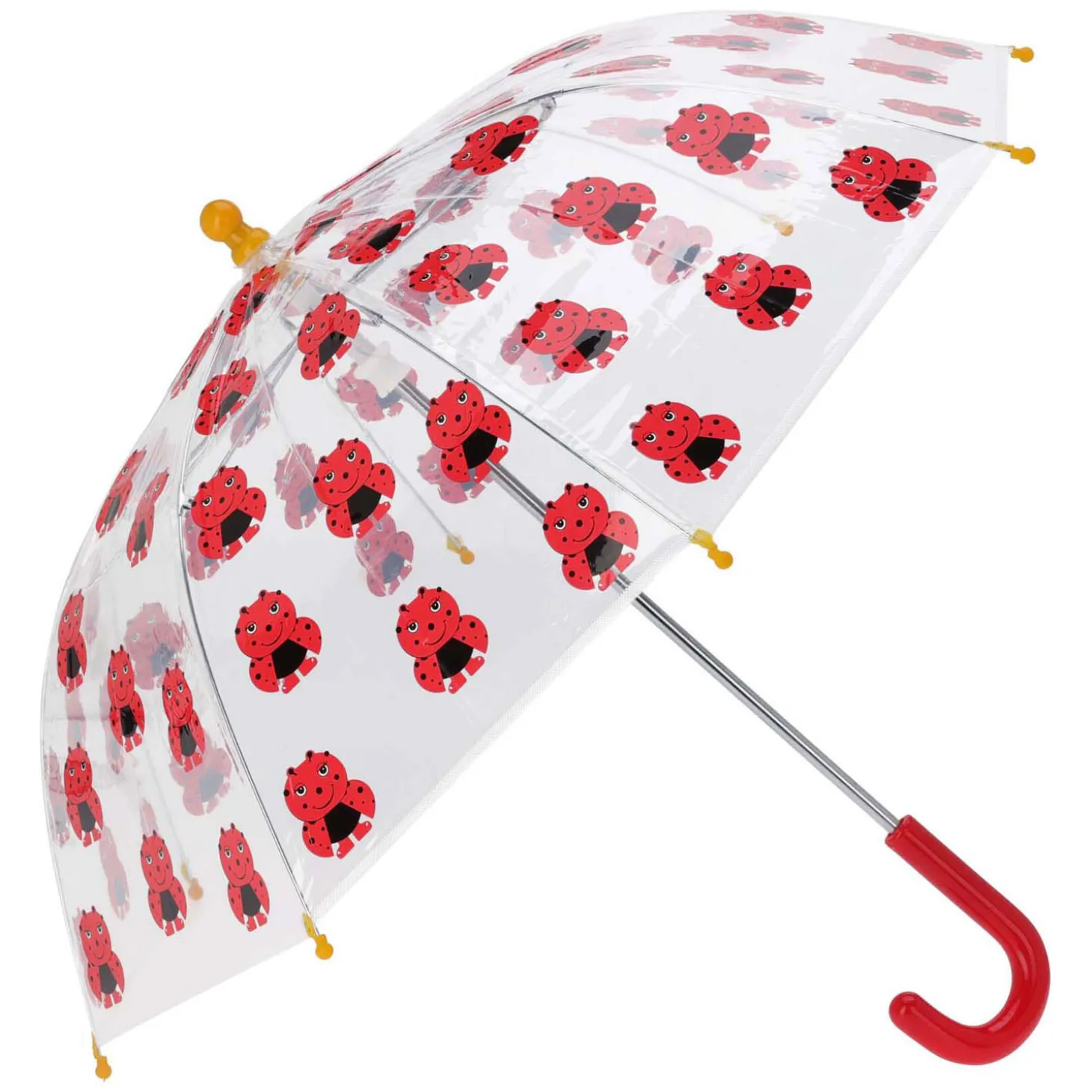 Stap vrolijk de regen door met deze leuke transparante kinderparaplu met print. De paraplu heeft een patroon van lieveheersbeestjes en een gebogen handvat van kunststof voor extra draaggemak voor kinderen.