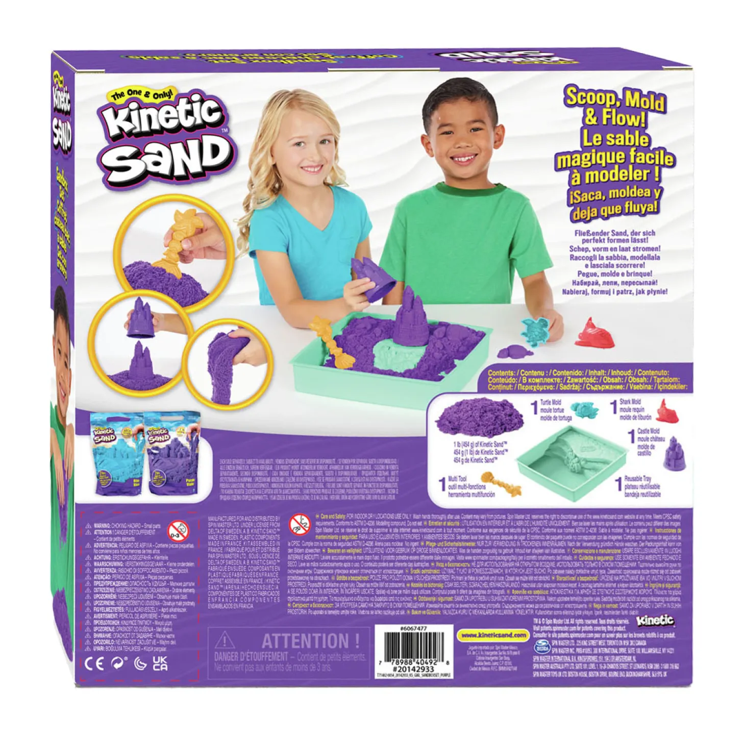 Inhoud: 454 g Kinetic Sand, 1 multitool, 1 schildpadvorm, 1 haaienvorm, 1 kasteelvorm, 1 tweelaagse herbruikbare bak