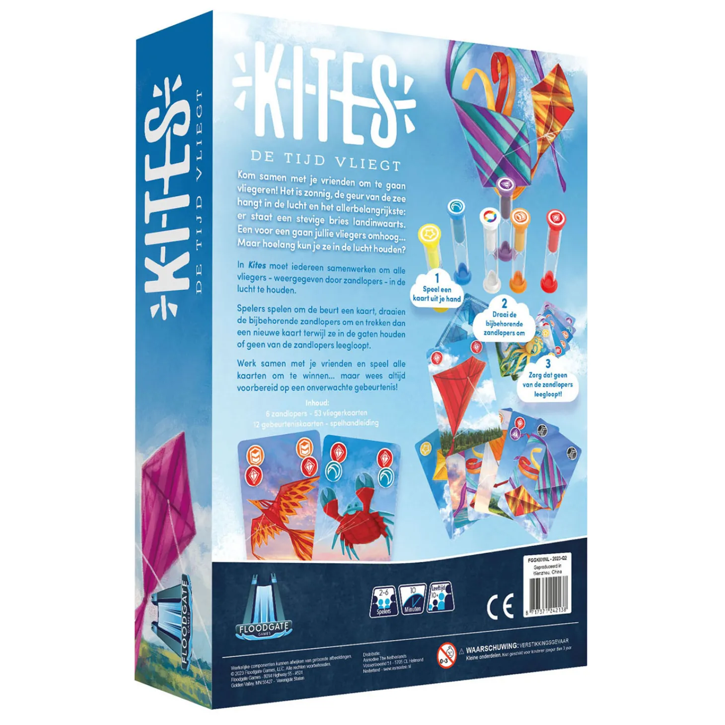 In Kites moet iedereen samenwerken om alle vliegers, uitgebeeld door zandlopers, in de lucht te houden. Spelers spelen om de beurt een kaart, draaien de bijbehorende zandlopers om en trekken dan een nieuwe kaart terwijl ze in de gaten houden of geen van de zandlopers leegloopt. Werk samen met je vrienden en speel alle kaarten om te winnen… maar wees altijd voorbereid op een onverwachte storm! De tijd vliegt…..