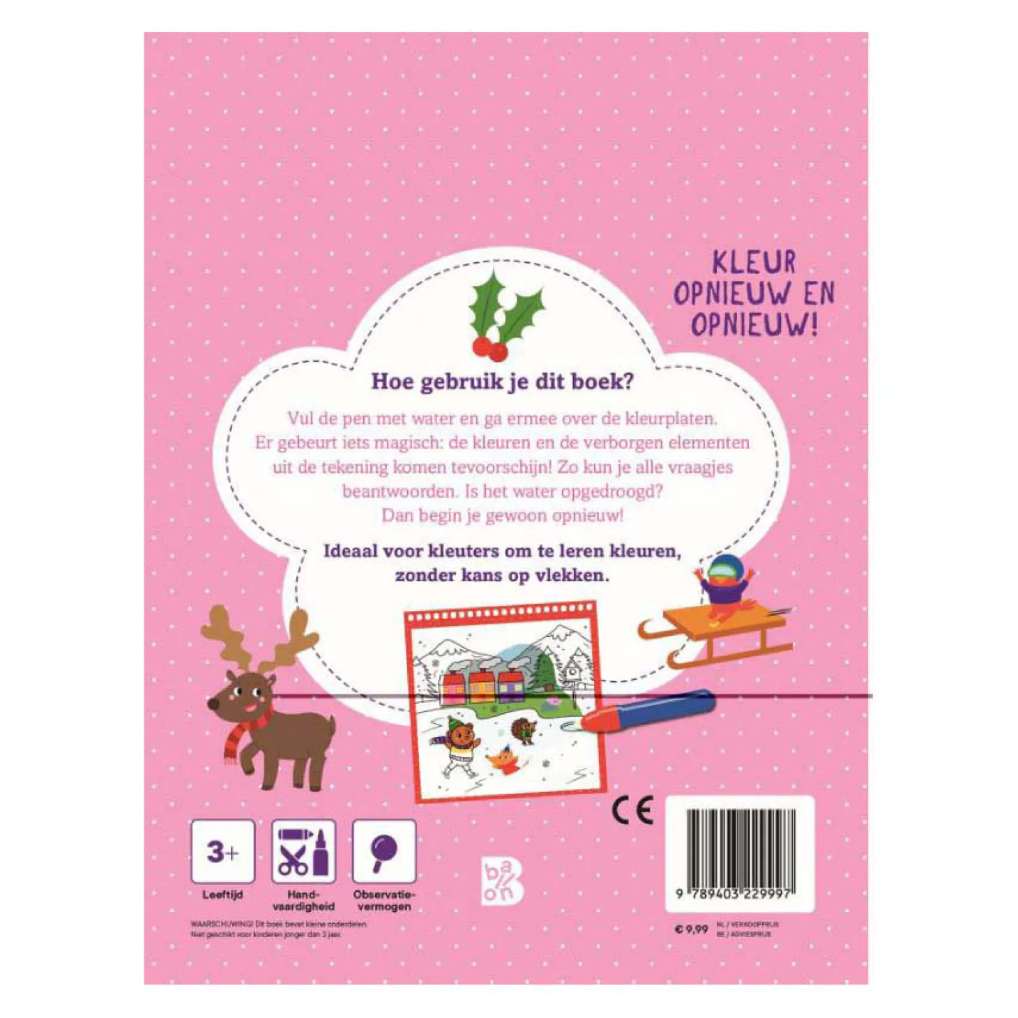 Vul de pen met water en ga ermee over de kleurplaten vol wintertaferelen. Er gebeurt iets magisch: de kleuren en de verborgen elementen uit de tekening komen tevoorschijn! Zo kun je alle zoekvraagjes beantwoorden. Is het water gedroogd? Dan begin je gewoon opnieuw! Ideaal voor kleuters om te leren kleuren, zonder kans op vlekken.