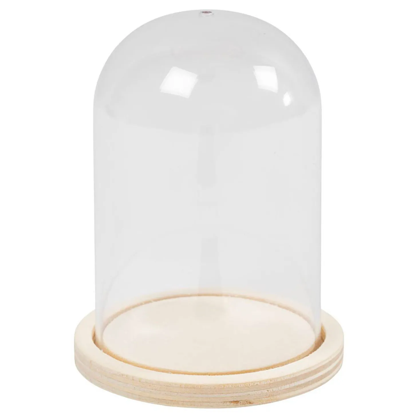 Ronde stolp van plexiglas met losse houten voet, klaar om gevuld te worden met creatieve displays.De ronde stolp van plexiglas kan zowel hangen als staan. Door het gat van 3 mm bovenin de stolp kan een ophangkoord aangebracht worden. Als je de stolp wilt ophangen, raden we aan om de houten basis vast te lijmen. Wil je echter een wisselende display in je stolp maken, hoef je de onderkant niet vast te lijmen