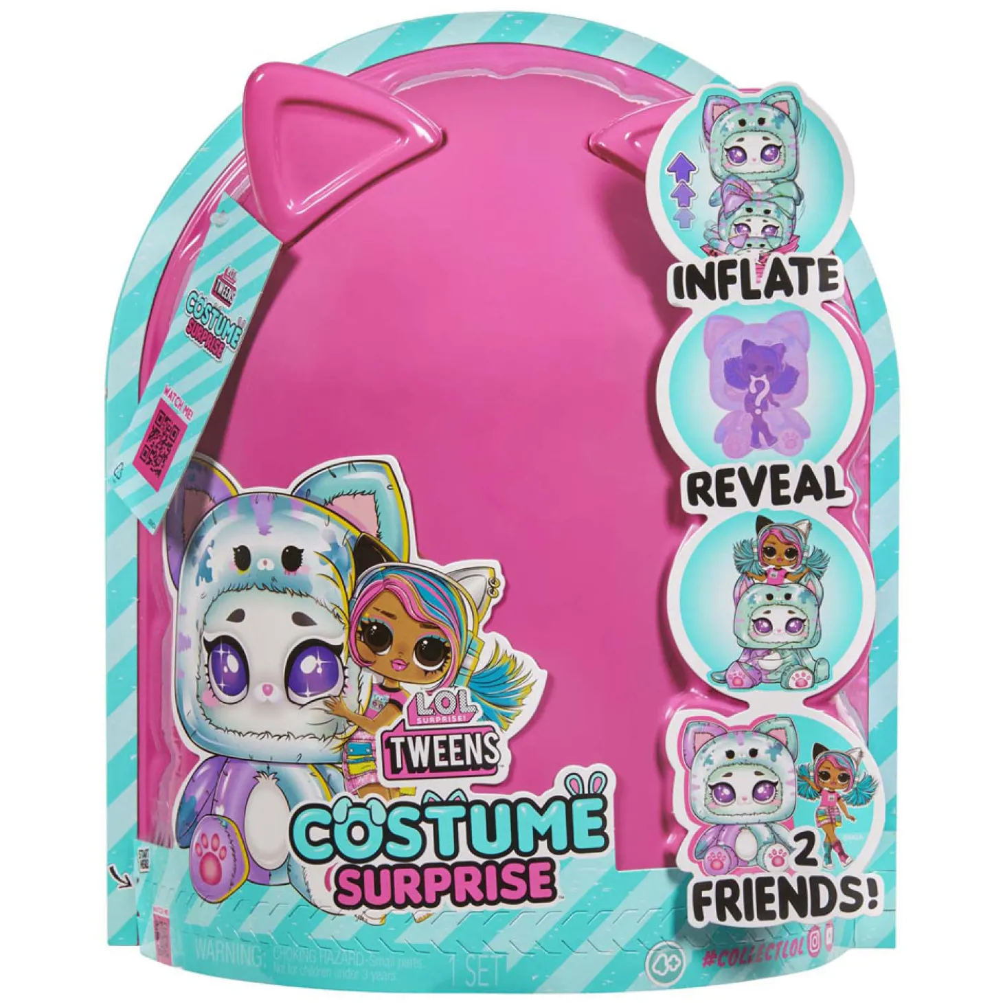 Bereid je voor om de ultieme verrassing uit te pakken en beleef een uitpakervaring zoals nog niet eerder met de gloednieuwe L.O.L. Surprise Tweens Costume Surprise™ met de populaire modepop Emma Emo in een prachtige, nieuwe look en met een schattig, opblaasbaar kittenkostuum. Deze superleuke onthullingservaring barst van de verschillende verrassingslagen, perfect om eindeloos fantasierijk mee te spelen en verhalen te verzinnen. Ontdek wat erin zit door eerst de rits onder in de verpakking open te trekken en het buitenste, roze omhulsel op te tillen. Zo onthul je mysterieus inpakpapier voor de eerste fase van het opblaasproces! Kijk hoe het papier zich vult en groter wordt. Nadat het helemaal is opgeblazen, scheur je het open om een lief, blauwgroen kittenkostuum te ontdekken! Maar wacht, dat is niet de enige verrassing! Open het klittenband op de achterkant van het kittenhoofd om je schitterende Tweens Emma Emo-pop te onthullen! Vergeet niet om de unieke verrassingen uit te pakken en haal de Tweens-pop uit haar poppenstandaard om haar de trendy, nieuwe mode en accessoires aan te trekken, zoals een modieuze rok, stijlvolle hoofdtelefoon met kittenoren die bij haar knuffelige kostuum passen en kleurrijke, elegante schoenen! Sluit het dierenkostuum en kijk hoe het groter wordt en zichzelf helemaal opblaast, waardoor je twee maatjes hebt om mee te spelen: Emma Emo en haar kittenkostuum! En er valt nog meer plezier te beleven: zet de aan-uitschakelaar onder in je dierenkostuum gewoon aan of uit om de opblaaspret steeds weer te herhalen! Elke Tweens-pop heeft een heel mooi gezichtje, glamourhaar, haar eigen fantastische stijl en beweegbare ledematen voor heel veel houdingen, plus haar nieuwe dierenkostuumvriendin! Verzamel alle 4 de schitterende L.O.L. Surprise Tweens Costume Surprise™-modepoppen en hun zachte dierenkostuums: Aya Cherry met haar konijnenkostuum, Emma Emo met haar kittenkostuum, Ali Dance met haar puppykostuum en Hoops Cutie met haar pandakostuum! Vergeet niet om alle 4 de Tweens-poppen en hun dierenkostuums in actie te zien en kijk de gloednieuwe L.O.L. Surprise SkateDance Movie die in oktober 2024 op YouTube Kids wordt uitgebracht!