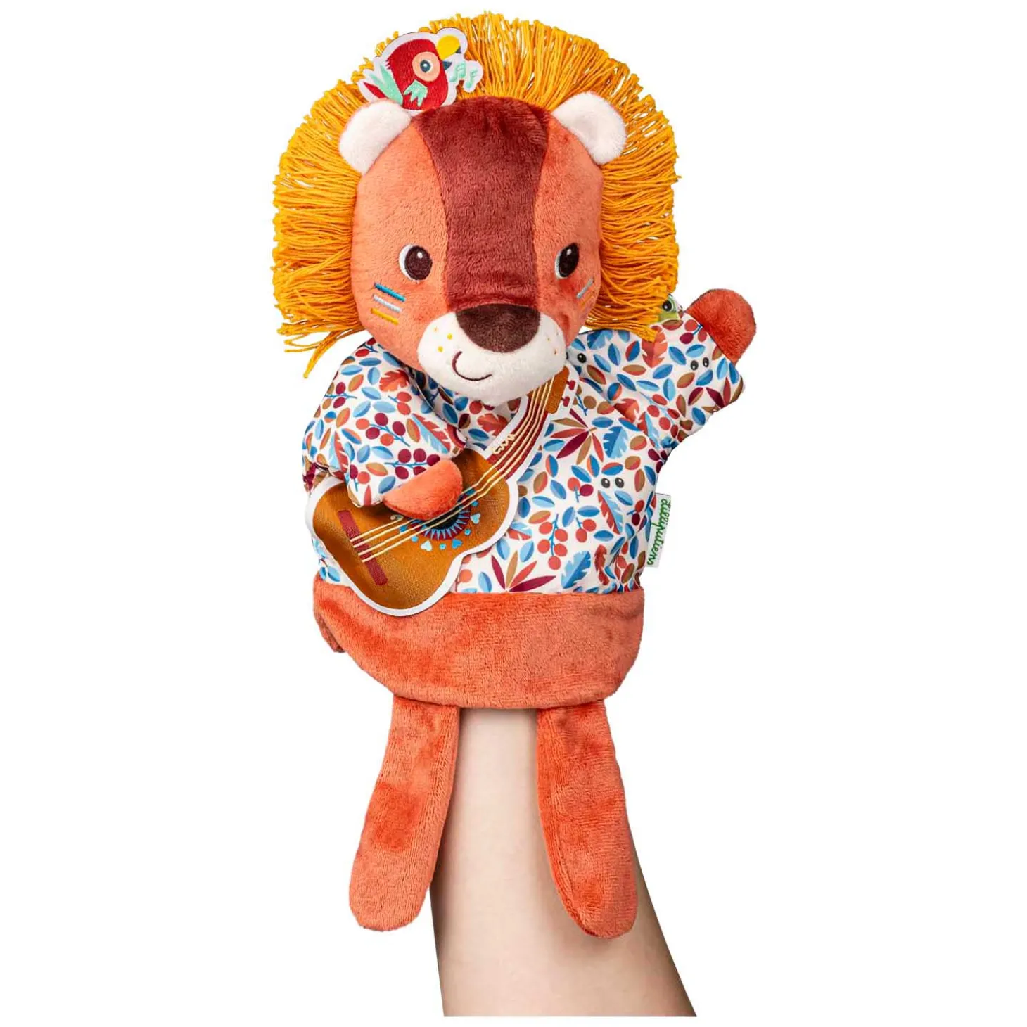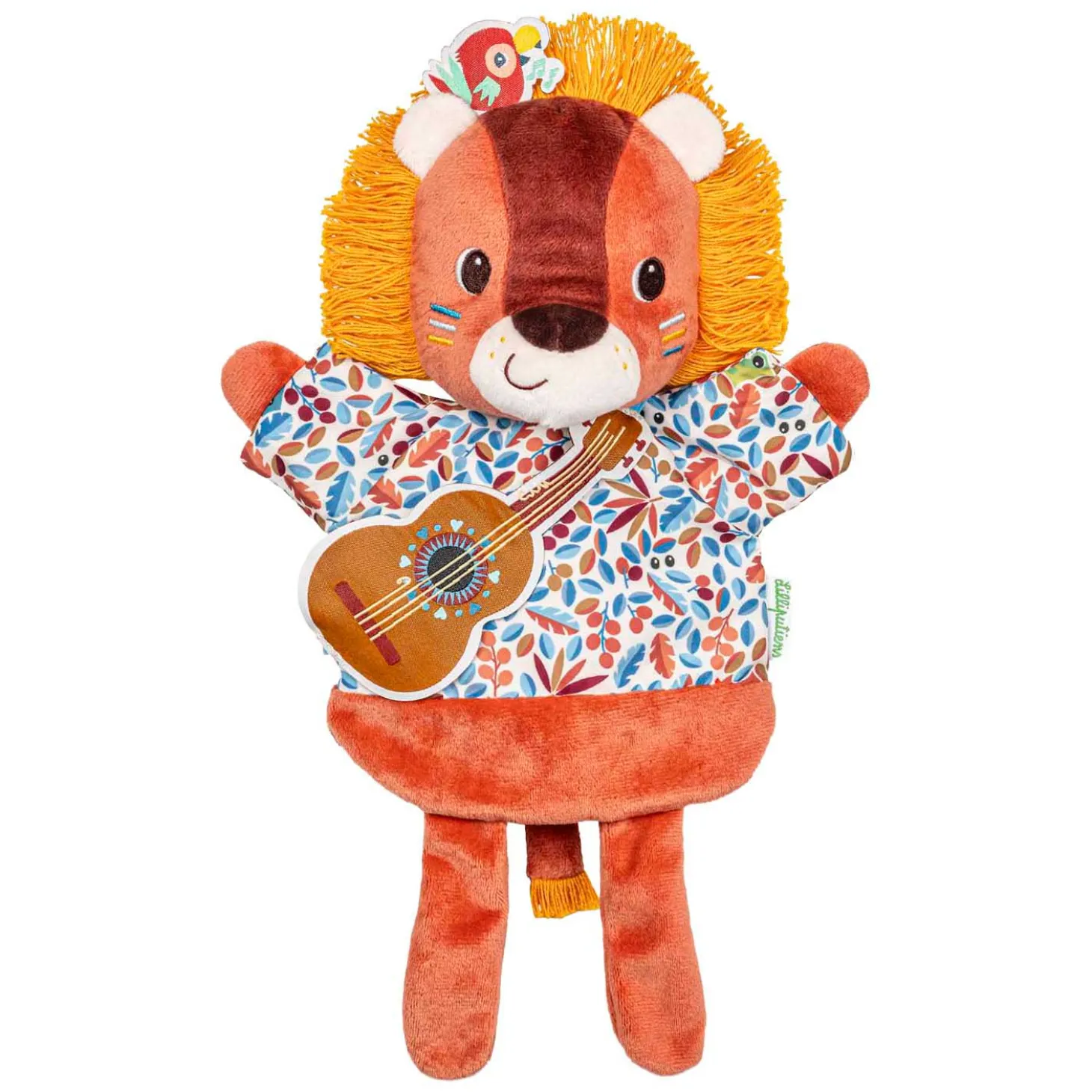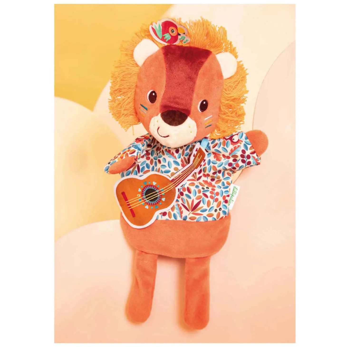 Met zijn gitaar begeleidt onze muzikale leeuw verhalen en liedjes met vrolijke zang. Hij heeft altijd wel een melodietje in zijn hoofd en zingt graag voor zijn vrienden in de jungle. Maar wie verstopt zich in zijn manen? Het is zijn vriendje de papegaai, die het refrein meezingt! Laat je hand door de zachte pluche pop glijden en laat je fantasie de vrije loop.
