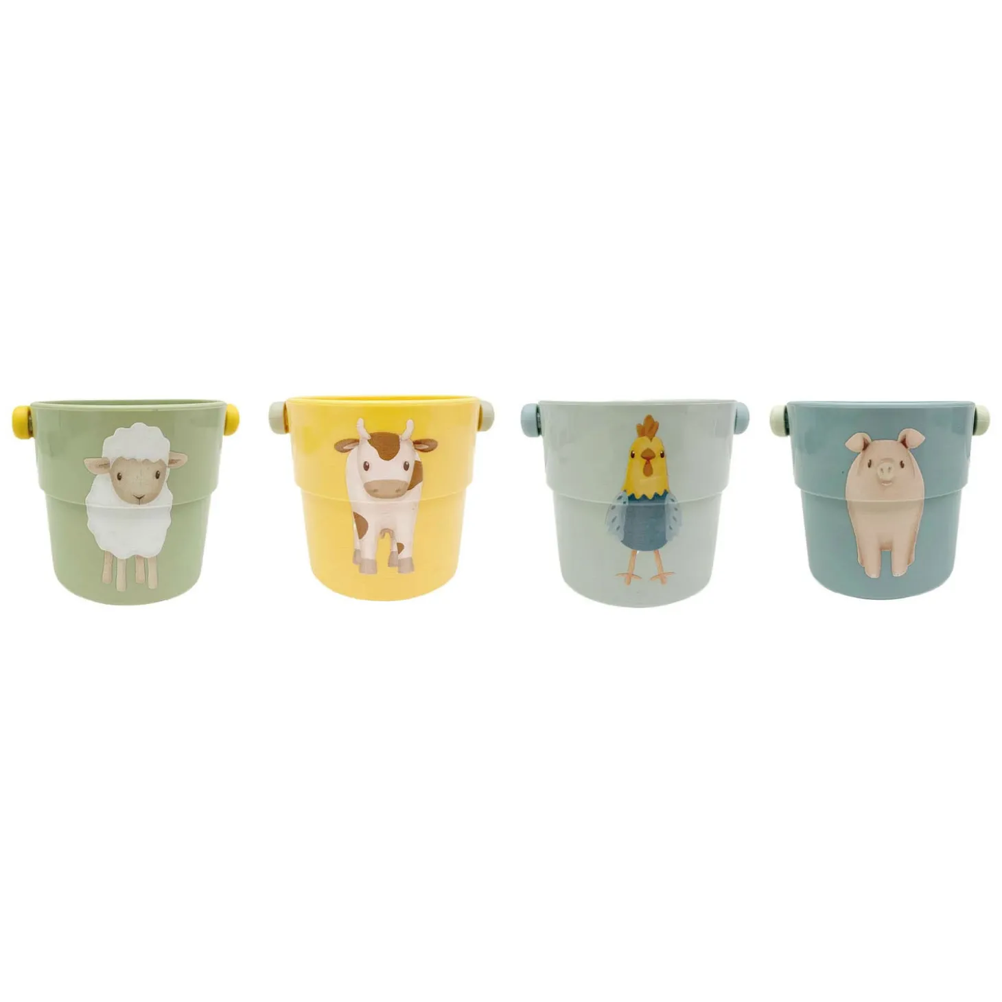 Stapelen, vullen, gieten en SPLASH! Je kleintje zal extra genieten tijdens het badderen met deze set van 4 badbekers. Ze zijn er in 4 kleuren en zijn versierd met illustraties van de boerderijdieren uit het FARM thema. De maat is precies goed voor kleine handjes en spelen met de kleine emmertjes helpt bij de ontwikkeling van motorische vaardigheden. Stapel ze op elkaar om een ??grote toren te bouwen en omver te werpen. Of vul ze met water en zie er verschillende vormen uitstromen. Spetters en plezier gegarandeerd! Verpakt in een full-colour windowbox. Geschikt voor kinderen vanaf 12 maanden.