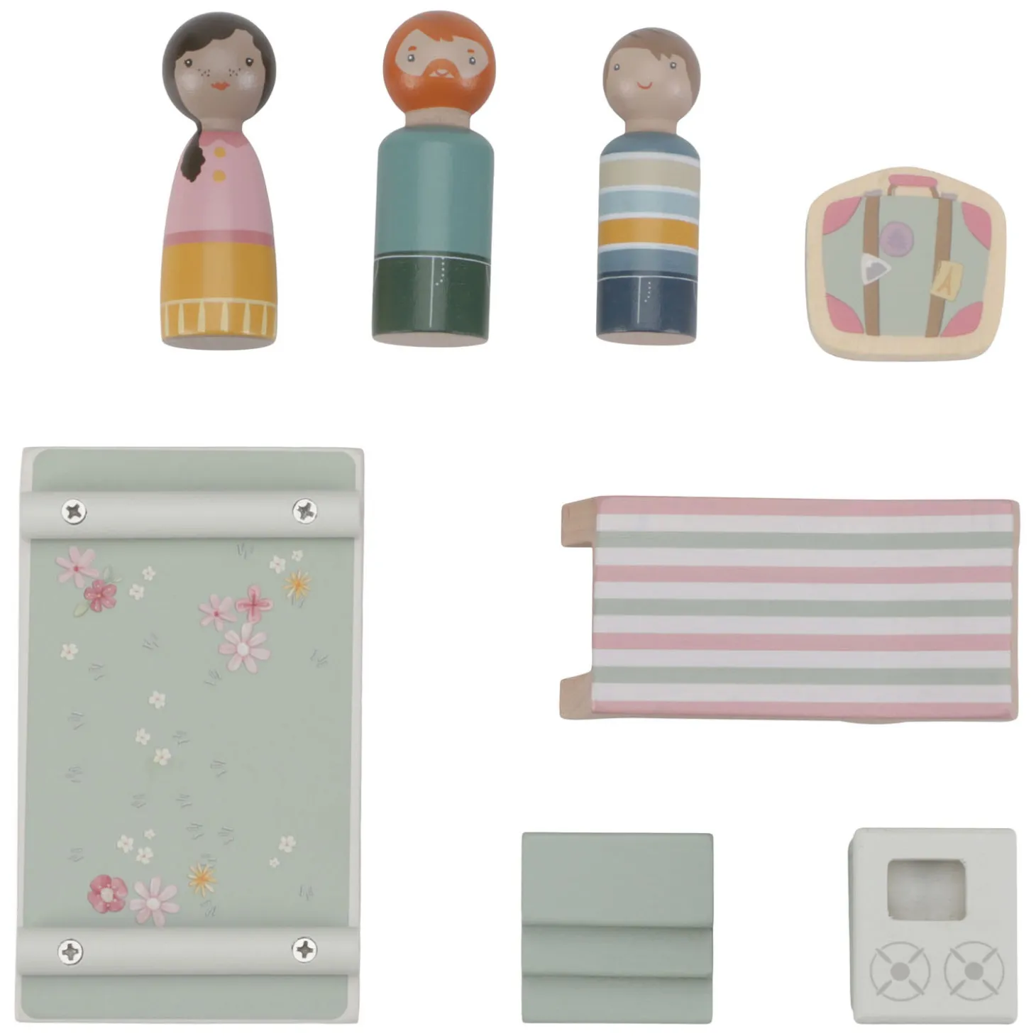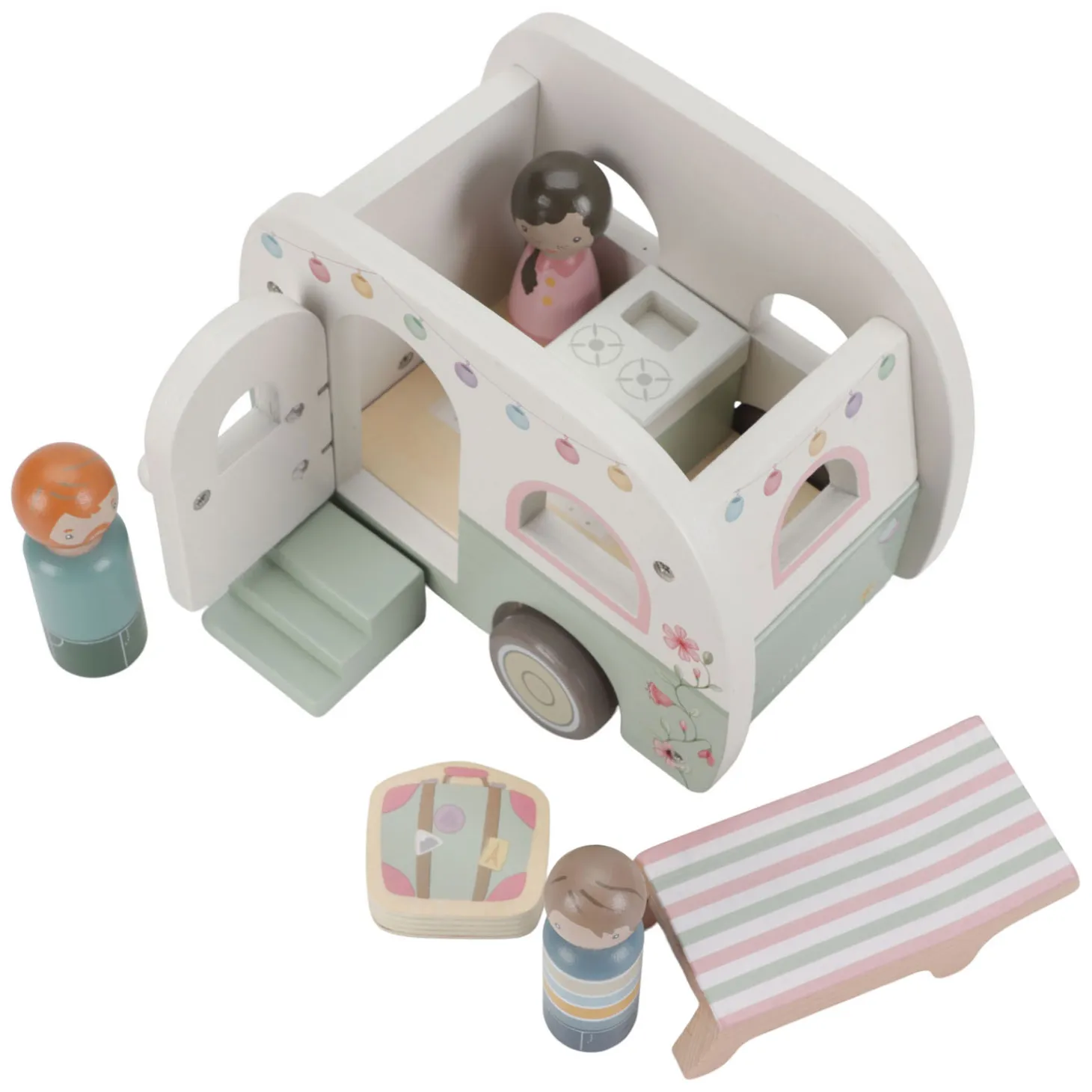 Laten we een droomreis maken en de weg op gaan! Ontdek de avontuurlijke wereld met de schattige roze auto met caravan en geniet van de vrijheid. Met de caravan maak je namelijk van elke plek een kampeerplek, waar je maar wilt. Of het nu de woonkamer, de speelkamer of de keuken is, haal de strandstoel tevoorschijn, pak de koffers uit en laat de 3 houten figuurtjes genieten van de omgeving.