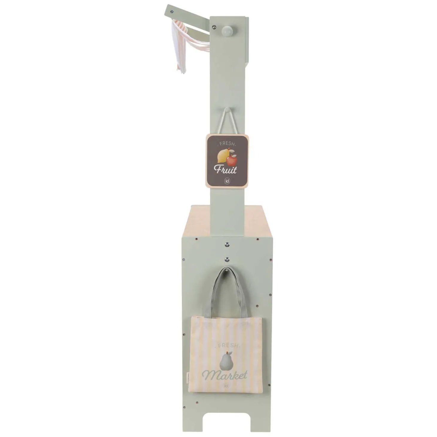 boodschappentas en kratten voor een echte winkelervaring. Draai de marktkraam om en het wordt een café, compleet met menukaart en vrolijke illustraties. Combineer het met de kassa, weegschaal of taartstandaard voor nog meer speelplezier. Wat staat er vandaag op het menu?