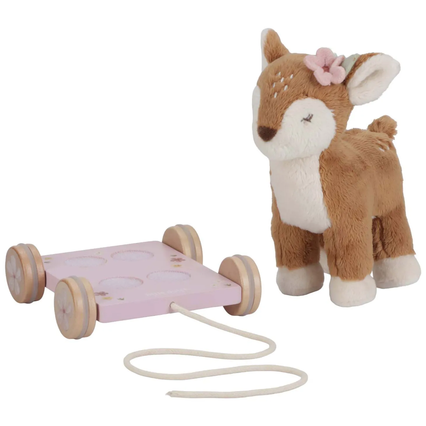 Neem het hertje met je mee! Trek aan het touwtje en ga samen op avontuur. Het hert zal je volgen door de betoverende tuin van Fairy Garden, waar de mooiste bloemen groeien en kleine feetjes zingen en dansen. Het zachte en knuffelige hert staat op een roze houten wagen versierd met bloemen. Met het kleine touwtje kan je kindje haar het hele huis laten zien en heerlijk spelen. Het schattige trekdier zal aanmoedigen om te lopen en helpen bij de motorische ontwikkeling.