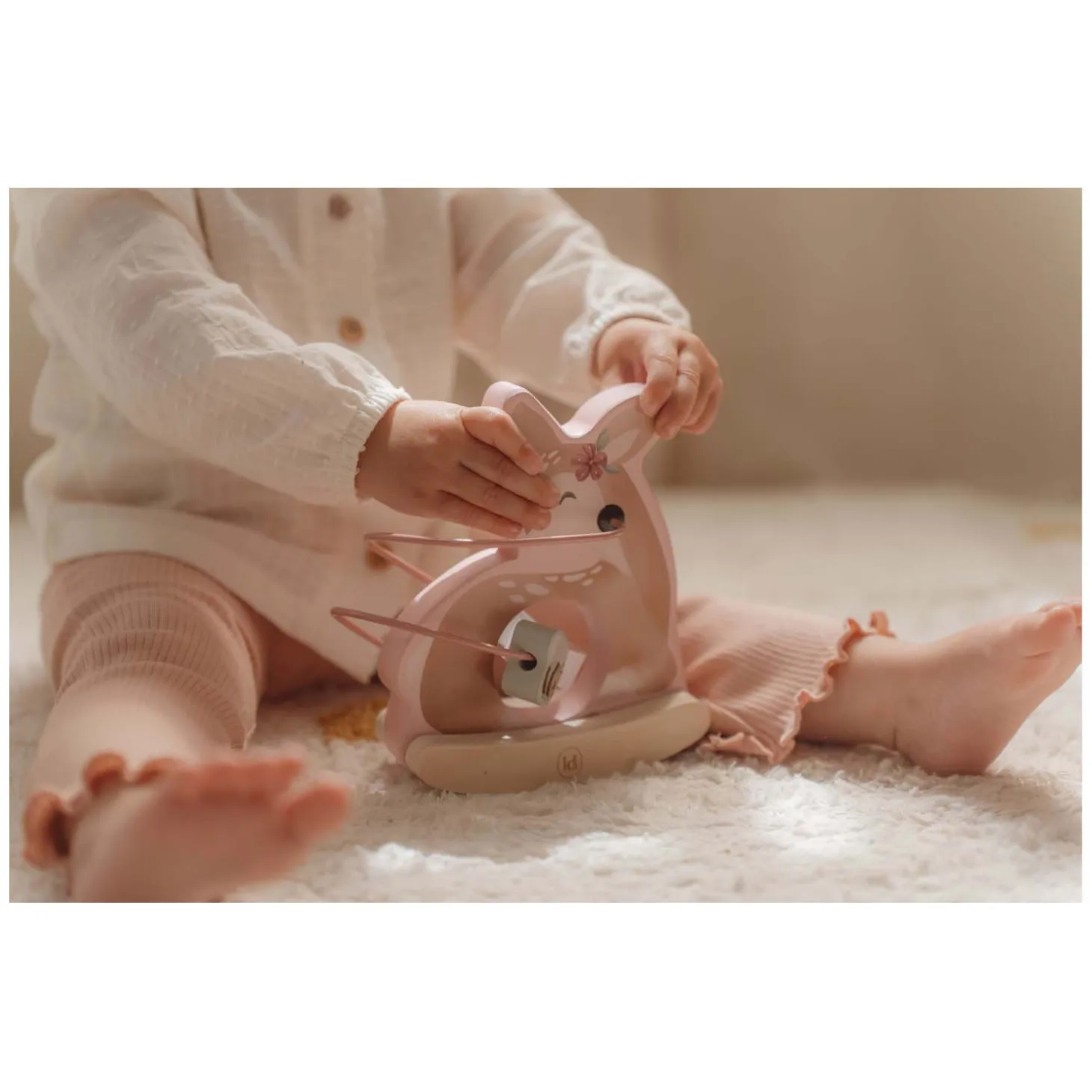 Laat de kralen één voor één rond het houten hertje draaien terwijl ze heen en weer schommelt. Dit schattige hertje nodigt je uit om haar een klein duwtje te geven, waardoor ze zachtjes beweegt op het gezoem van de bij die om haar heen fladdert. Samen met de bloemen, bladeren en paddenstoelen van Fairy Garden, danst de bij vrolijk over het spiraalvormige pad rondom het hertje. Dit lieve wiebeldier bevordert niet alleen spelenderwijs de motorische vaardigheden, maar staat ook prachtig als decoratie in de kinderkamer.