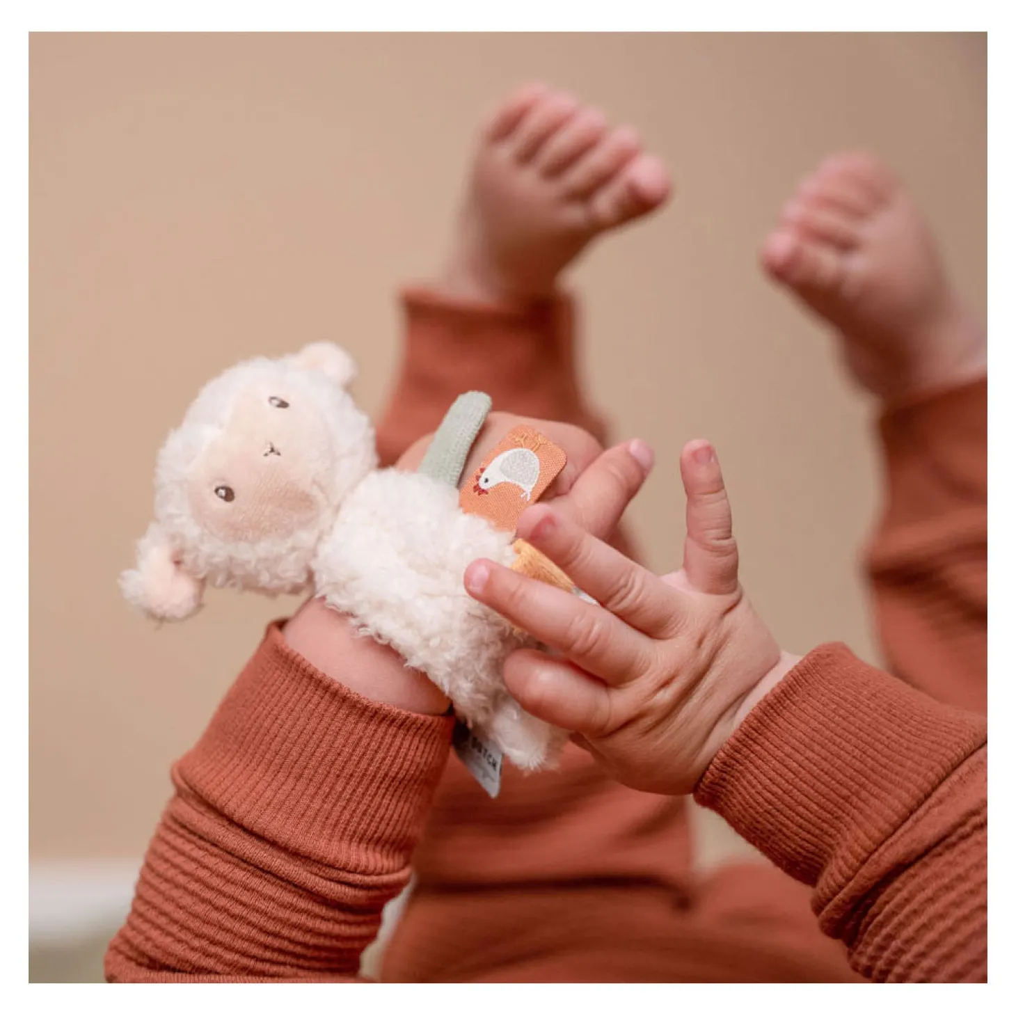 Zwaai met je handen en laat je verrassen! Wat zal je baby enthousiast worden van deze armbandrammelaar. Doe hem om de pols van je kleintje en laat het ratelende plezier maar beginnen. De knuffelige schaap bovenop de armband is klaar om te bewegen! Maar er is meer te ontdekken. De labels stimuleren je kindje om te voelen en te grijpen. Geweldig vermaak voor een blije baby.