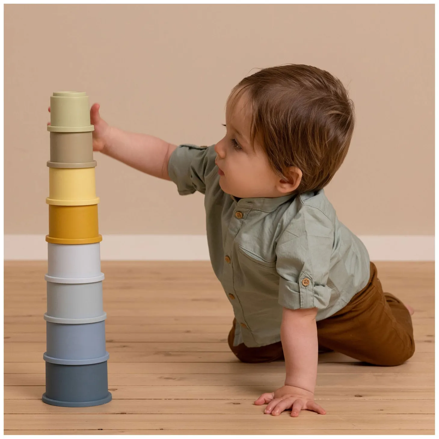 1,2,3 hoe hoog wordt de toren?! Deze set met bekers daagt je peuter uit om ze één voor één op elkaar te stapelen.. Hoe groot zal de vreugde zijn als de toren helemaal staat! En hoe leuk is het om de toren weer om te gooien! Uren speelplezier gegarandeerd. Met de vier vrolijke tinten zullen de bekers je kleintje zeker vermaken. De 8 stapelbekers hebben een nummer aan de bovenkant en passen gemakkelijk in elkaar om te voorkomen dat de toren te snel valt. Je kleintje leert over cijfers en ontwikkelt fijne motoriek. Stapel en maak de toren in de box, op de vloer of in de badkuip of zandbak. Dankzij het veelzijdige materiaal kan het overal worden gebruikt. Plaats de kleine bekers in elkaar om ze eenvoudig op te bergen. De toren bestaat uit 8 stapelbekers, variërend in diameter tussen 6 en 9,5 cm en de toren is in totaal 43 cm hoog als je alle bekers op elkaar zet. Wordt geleverd in full-colour doos. Geschikt voor kinderen vanaf 6 maanden.