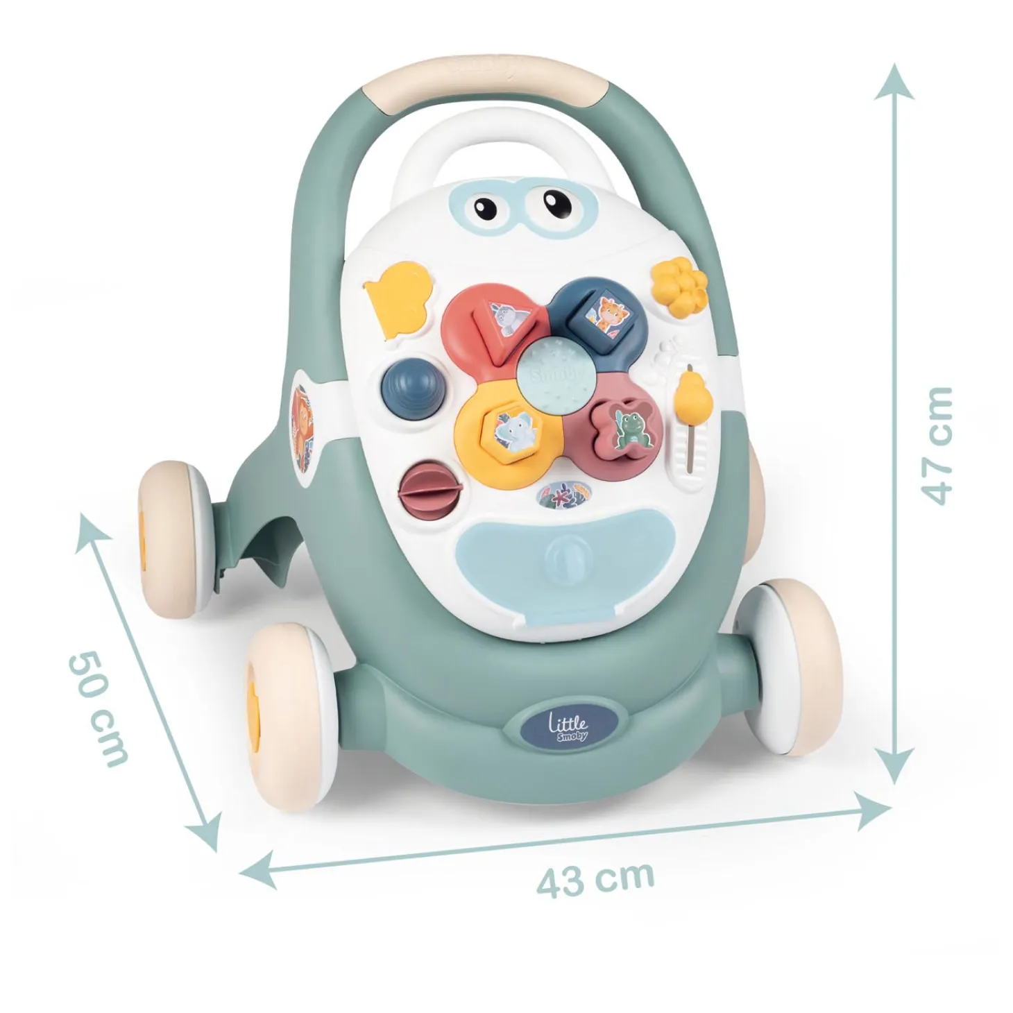 Op het activiteitenplatform is er van alles te ontdekken voor je kleintje. Draaiende oogjes, een vormenstoof, draai-, schuif- en duwknoppen, een toeter, spiegeldeurtje en nog veel meer. Het activiteitenbord is los te maken van de loopwagen, dus ook los te gebruiken op de vloer.