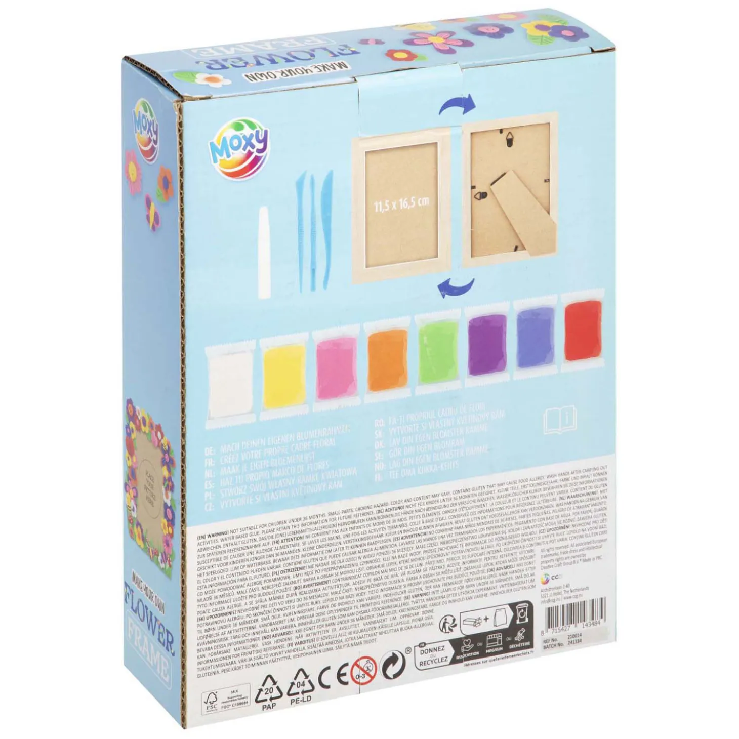 Geschikt voor kinderen vanaf 6 jaar. Het lijstje is 11,5 x 16,5 cm groot en de set bevat 8 kleuren klei.