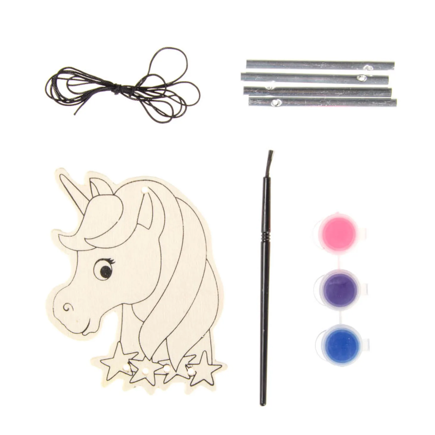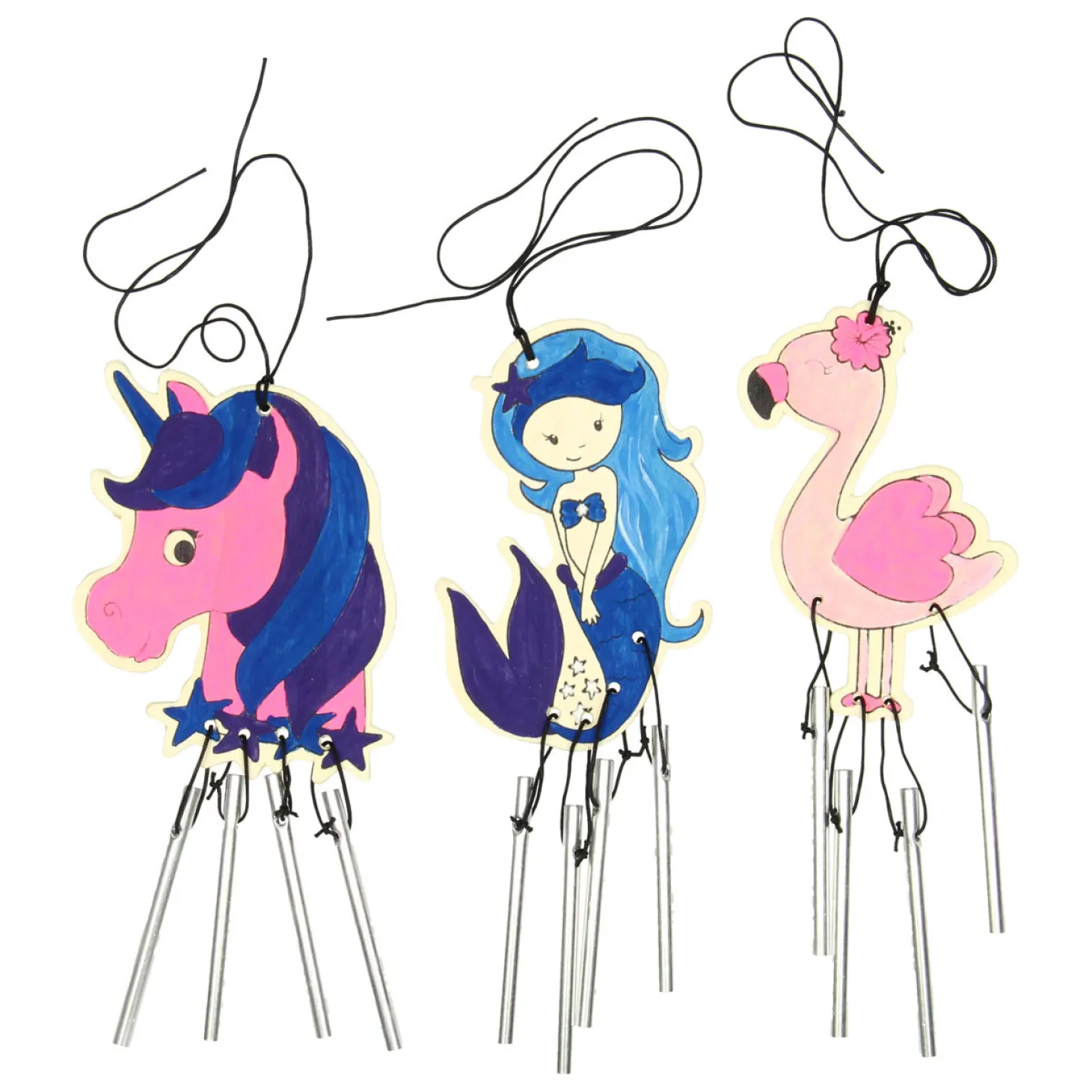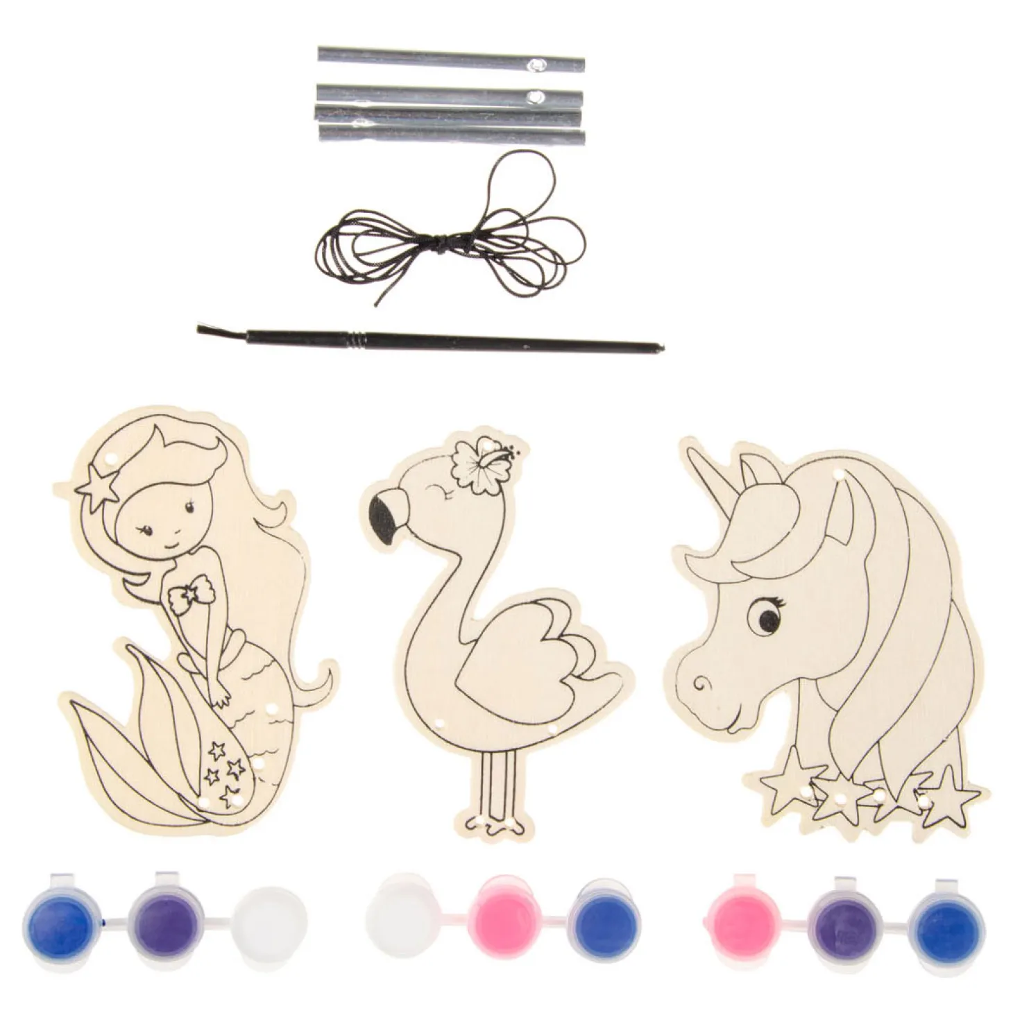 Begin eerst met het beschilderen van het figuur in vrolijke kleuren. Laat het drogen en bevestig daarna de touwtjes met de metalen staafjes. Klaar! Nu kun je hem buiten ophangen op een mooi plekje. Er zijn drie verschillende modellen: een eenhoorn, een flamingo of een zeemeermin.Prijs per stuk, verschillende uitvoeringen/kleuren worden door elkaar geleverd.