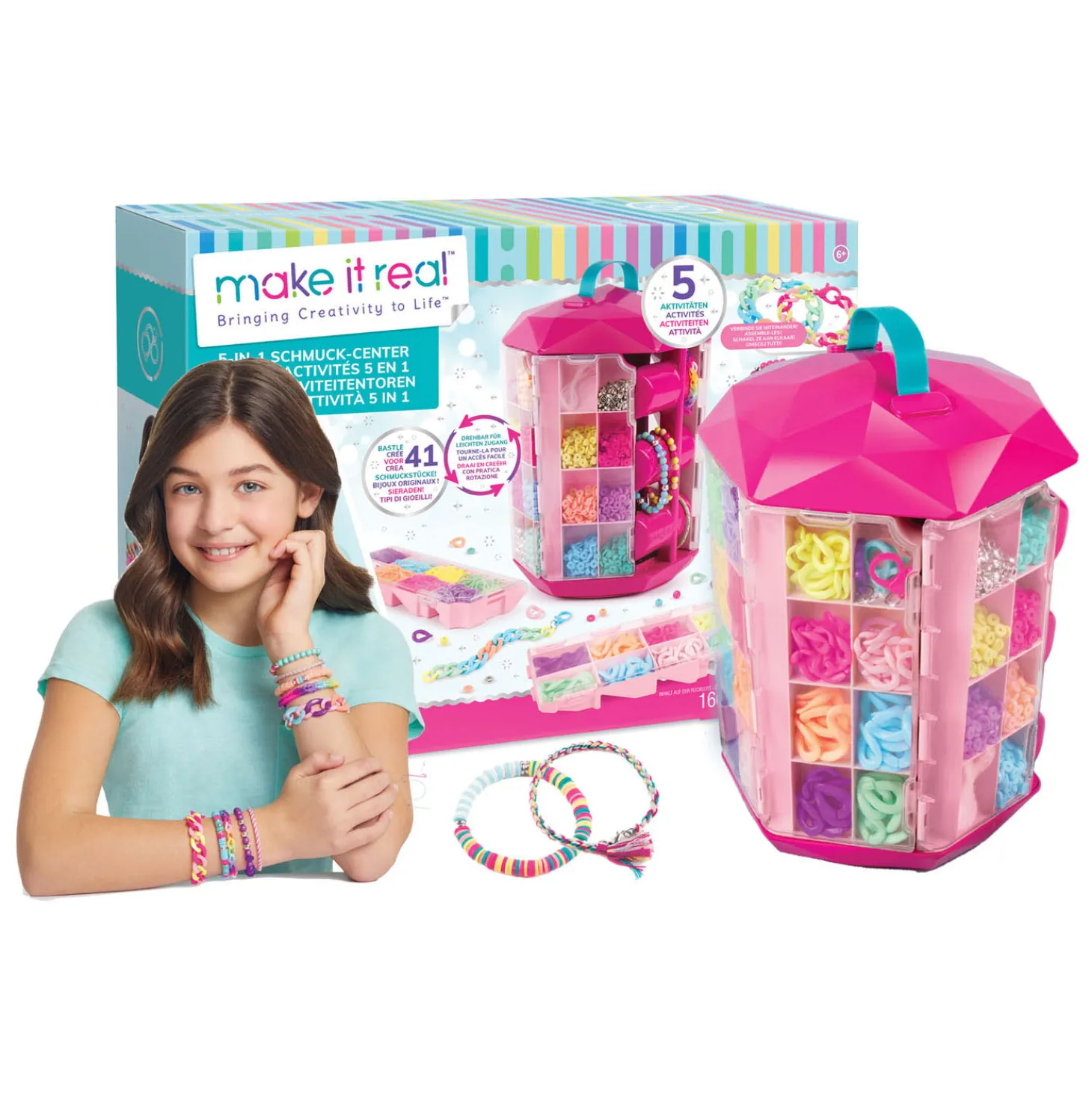 De armbandsets van Make it Real zijn geweldige cadeaus voor meisjes, tieners en tieners die van mode houden en genieten van knutselen en sieraden maken. Download de gratis ‘Make it Real’ app en ontdek de foto en video instructies, adviezen van professionele influencers, een forum om ideeën te delen met vrienden over de hele wereld! Afmeting verpakking: 37x10x27 cm (lxdxh). Leeftijdsindicatie: 6 jaar+.