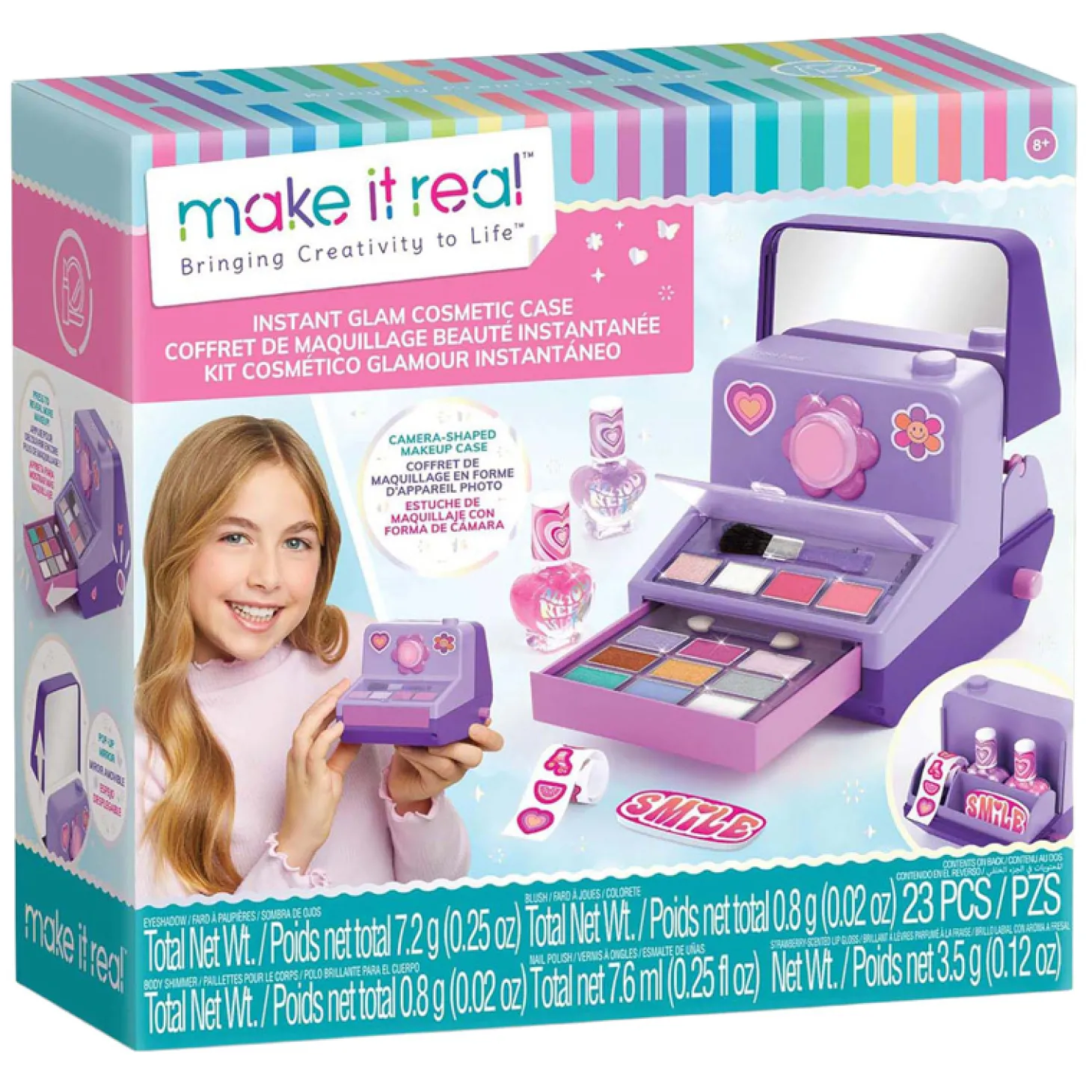Inhoud: 9 oogschaduwkleuren, 1 oogschaduwapplicator, 2 kleuren blush, 2 kleuren lichaamsglitter, 1 make-upborsteltje, 1 lipgloss, 2 x nagellak, 1 nagelvijl, 1 stickerrol, 1 sickervel, 1 instructieblad