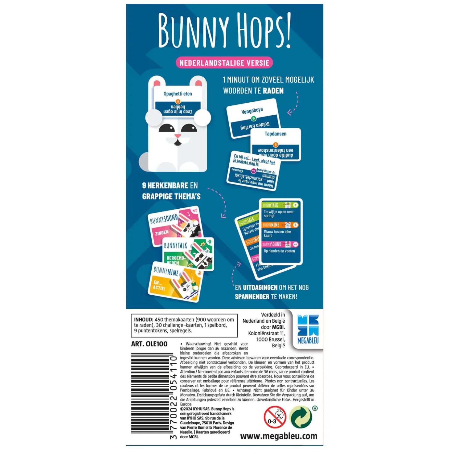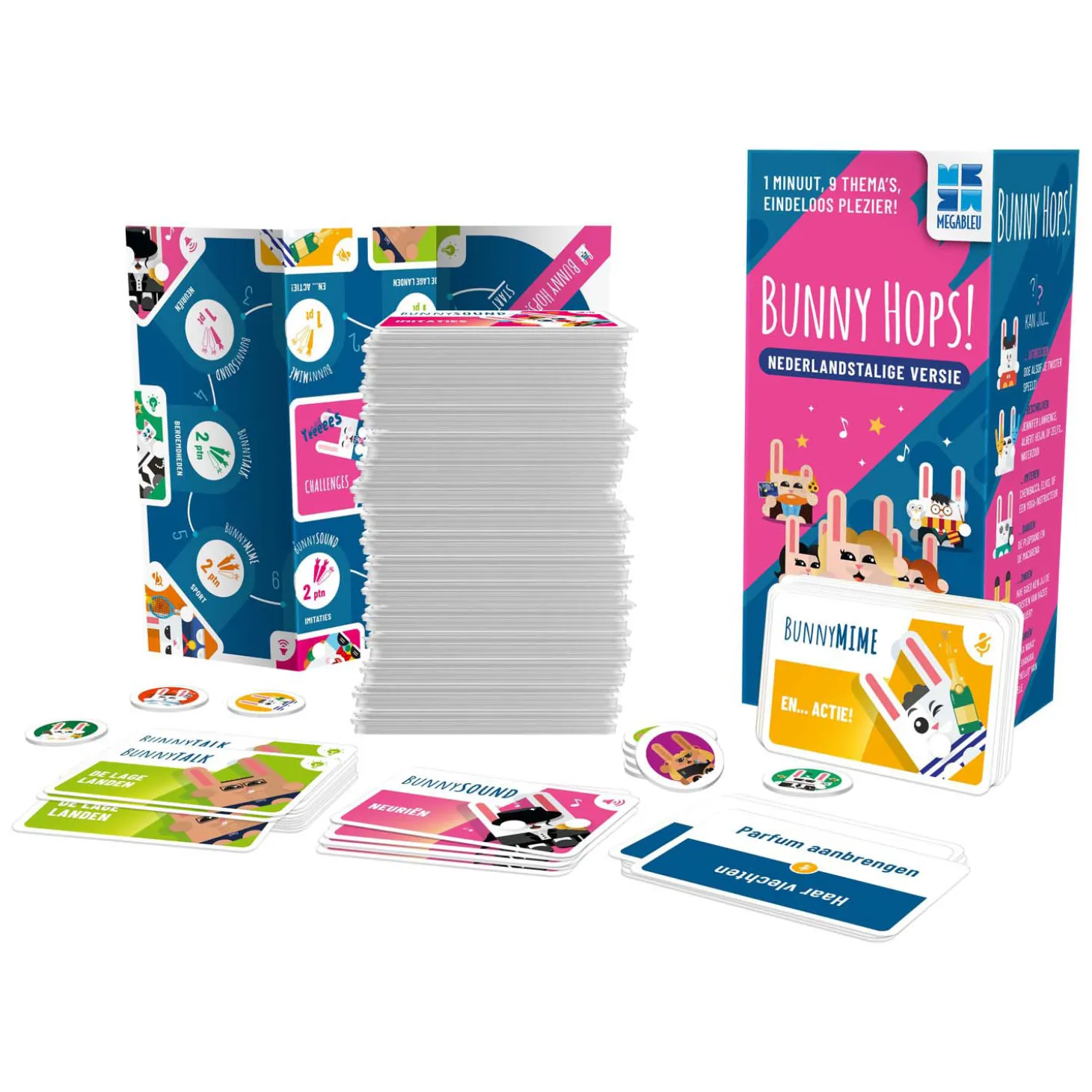 Inhoud: 450 themakaarten, 30 challenge kaarten, 9 tokens, 1 spelbord, spelregels.