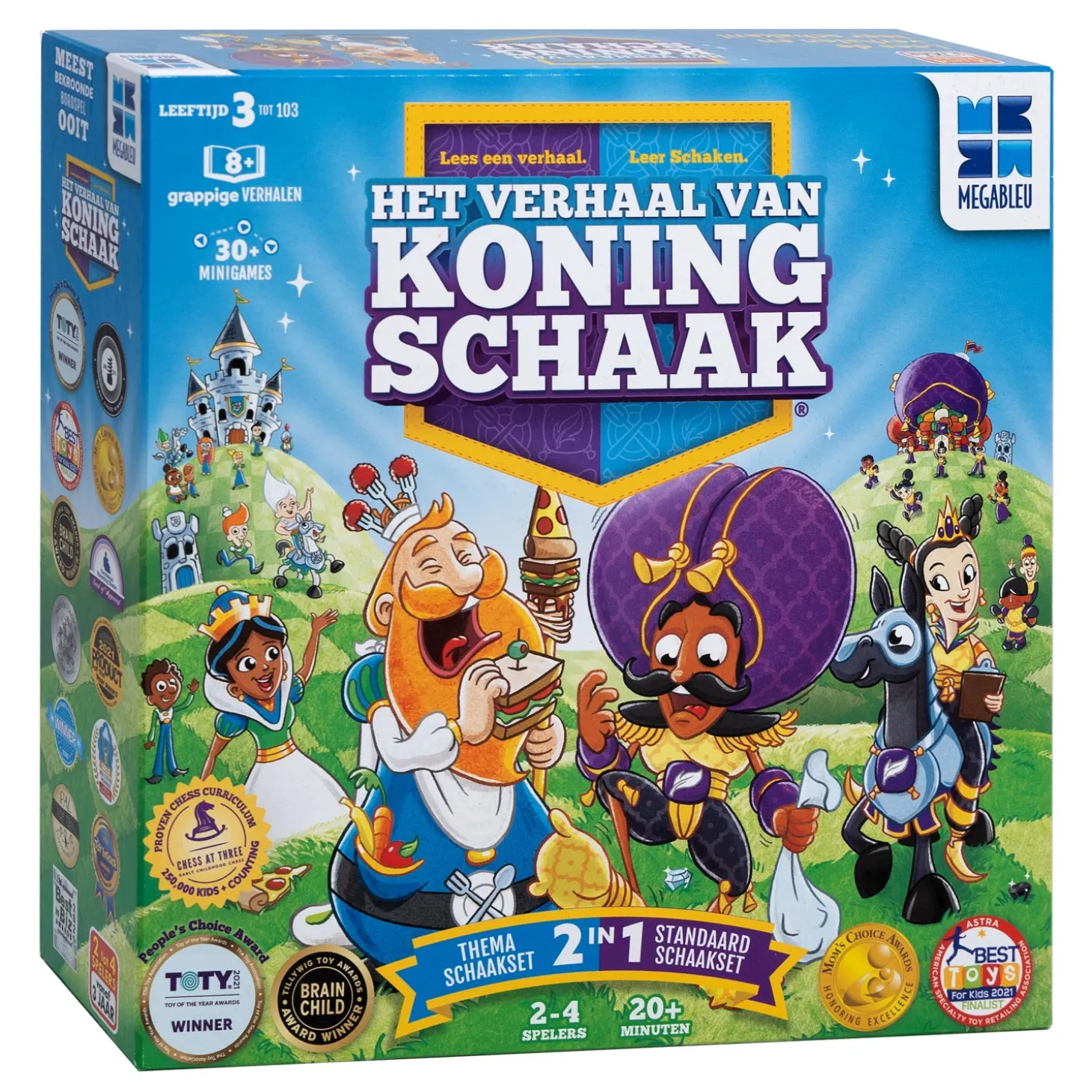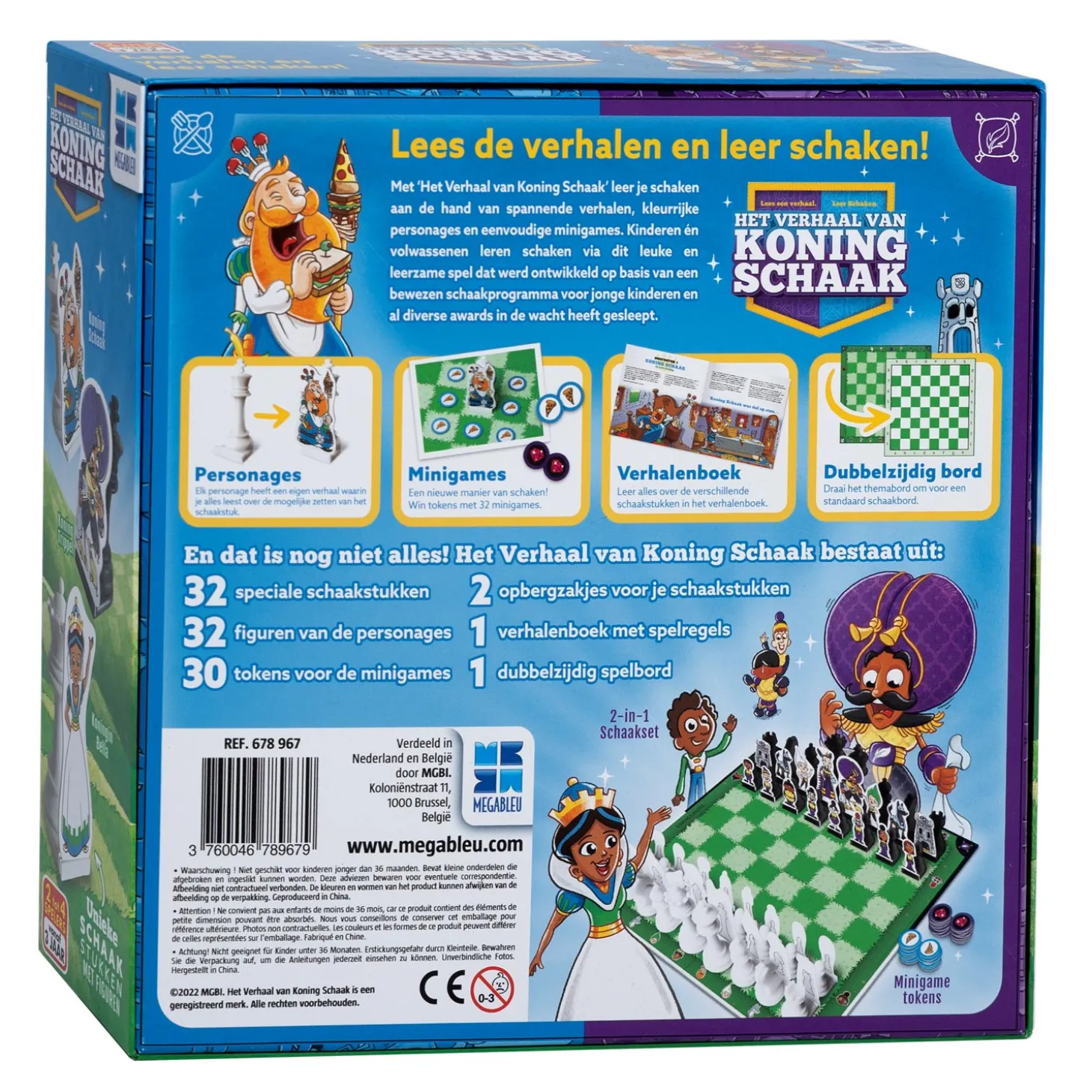 Het Verhaal van Koning Schaak is een bordspel dat jonge kinderen leert schaken met behulp van gekke verhalen, levendige illustraties, aangepaste schaakstukken en een uniek schaakbord.
